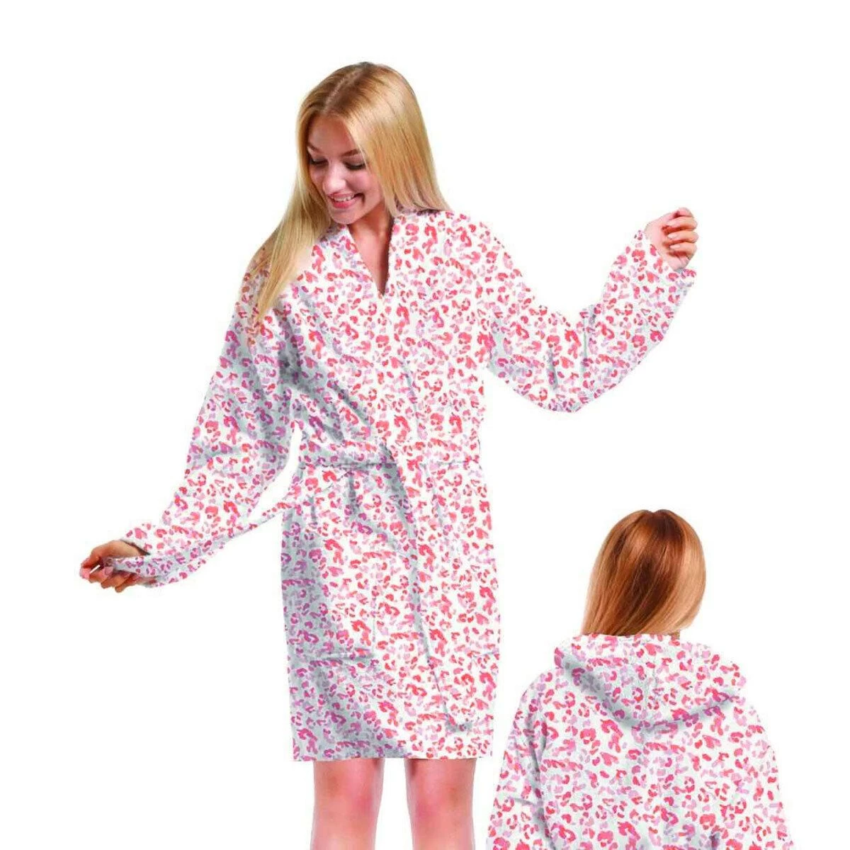 | Dettagli | La confezione contiene un accappatoio da donna Dotato di cappuccio, tasche anteriori e passanti con cintura Motivo animalier maculato Da un lato spugna velour cinigliata, dall’altro spugna di cotone a riccio Morbida spugna di puro cotone, altamente assorbente |