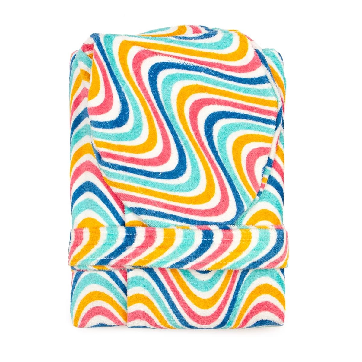 Magiche onde colorate si rincorrono sull’accappatoio Monteverde realizzato in puro cotone. Comode tasche anteriori completano un capo adatto alla sala da bagno.