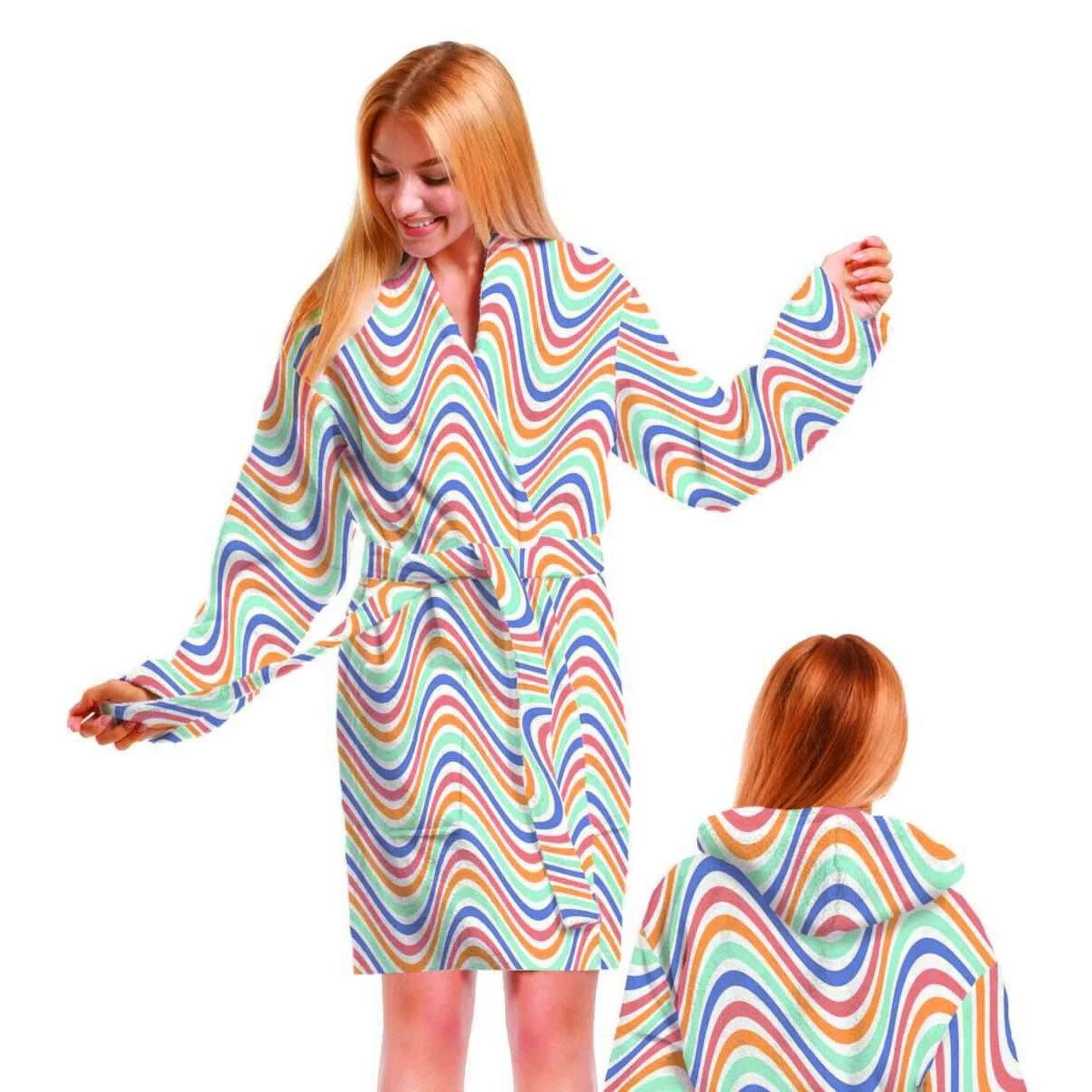 | Dettagli | La confezione contiene un accappatoio da donna Dotato di cappuccio, tasche anteriori e passanti con cintura Motivo stampato con onde multicolor Da un lato spugna velour cinigliata, dall’altro spugna di cotone a riccio Morbida spugna di puro cotone, altamente assorbente |