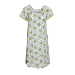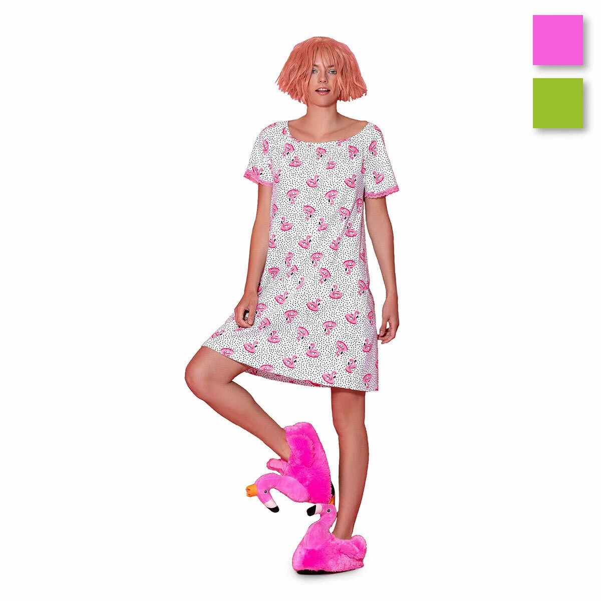 | Dettagli | La confezione contiene una camicia da notte per donna Scollo tondo con mezza manica Applicazione di passamaneria sulle maniche in corodinato di colore Jersey di puro cotone MStampa con fenicotteri e pois Lunghezza media al ginocchio Jersey di cotone, fresco e leggero, ideale per il periodo estivo Utilizzabile anche come abito da casa Confezionato in una scatola stampata |