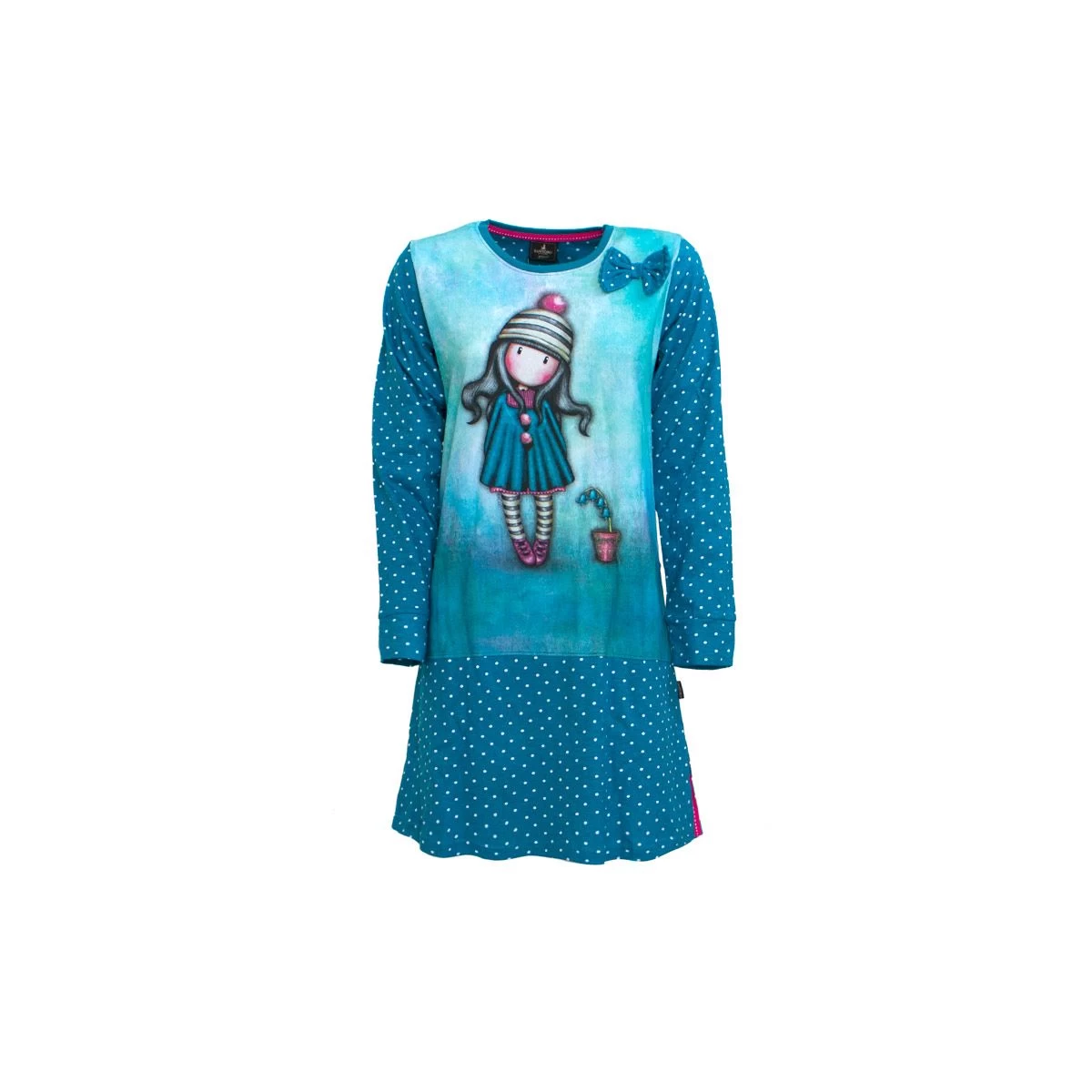 Gorjuss è una tenera bambina dai lunghi capelli neri e dalle caratteristiche calze a righe. E’ l’autoritratto della sua illustratrice, famosa in tutto il mondo. La camicia da notte che la rappresenta è realizzata in morbido e caldo cotone, perfetta per proteggersi dal freddo pungente delle serate invernali.