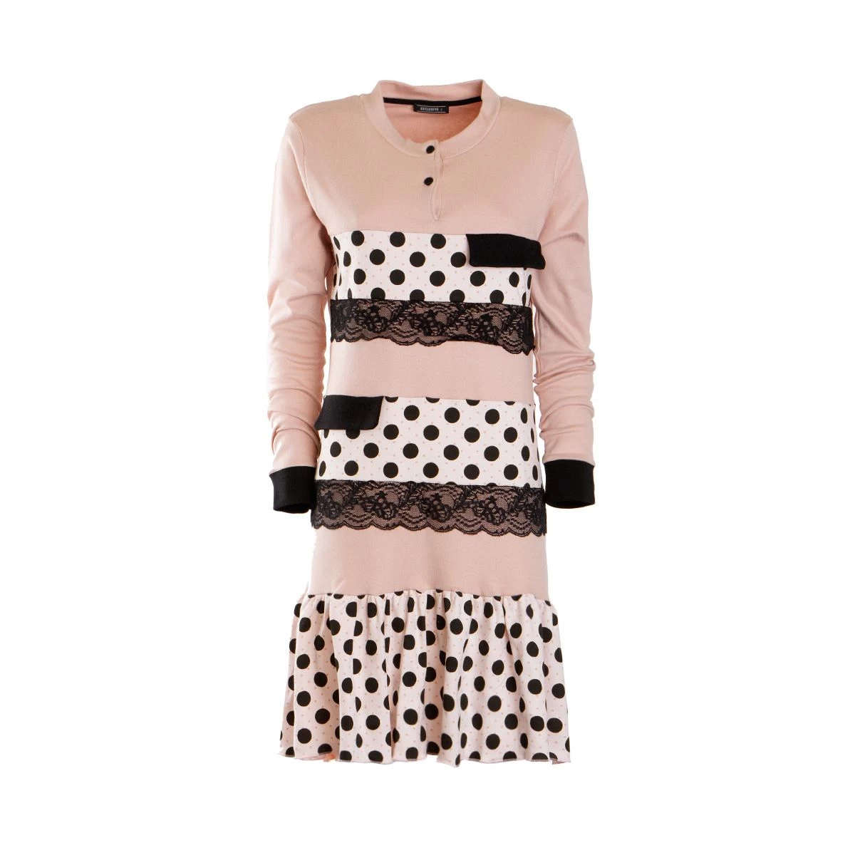 | Dettagli | La confezione contiene una camicia da notte per donna Scollo serafino con bottoncini Polsini in contrasto di colore Volants con motivo a pois posti sulla parte inferiore Applicazioni in pizzo ed in tessuto con motivo a pois Lunghezza media al di sopra del ginocchio Caldo cotone ideale per il periodo invernale Confezionata in una scatola stampata |