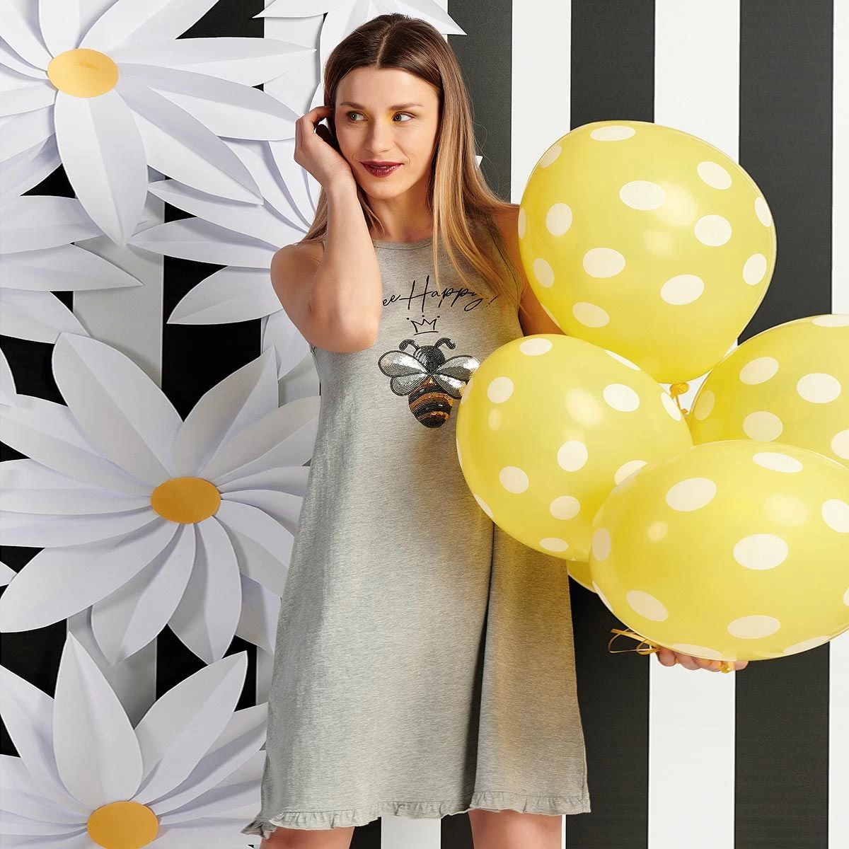| Dettagli | La confezione contiene una camicia da notte estiva Spalla larga e girocollo Smerlo applicato sul bordo inferiore Ape realizzata con paillettes e scritta stampata Bee Happy Fresca e leggera Confezionata in una scatola stampata |