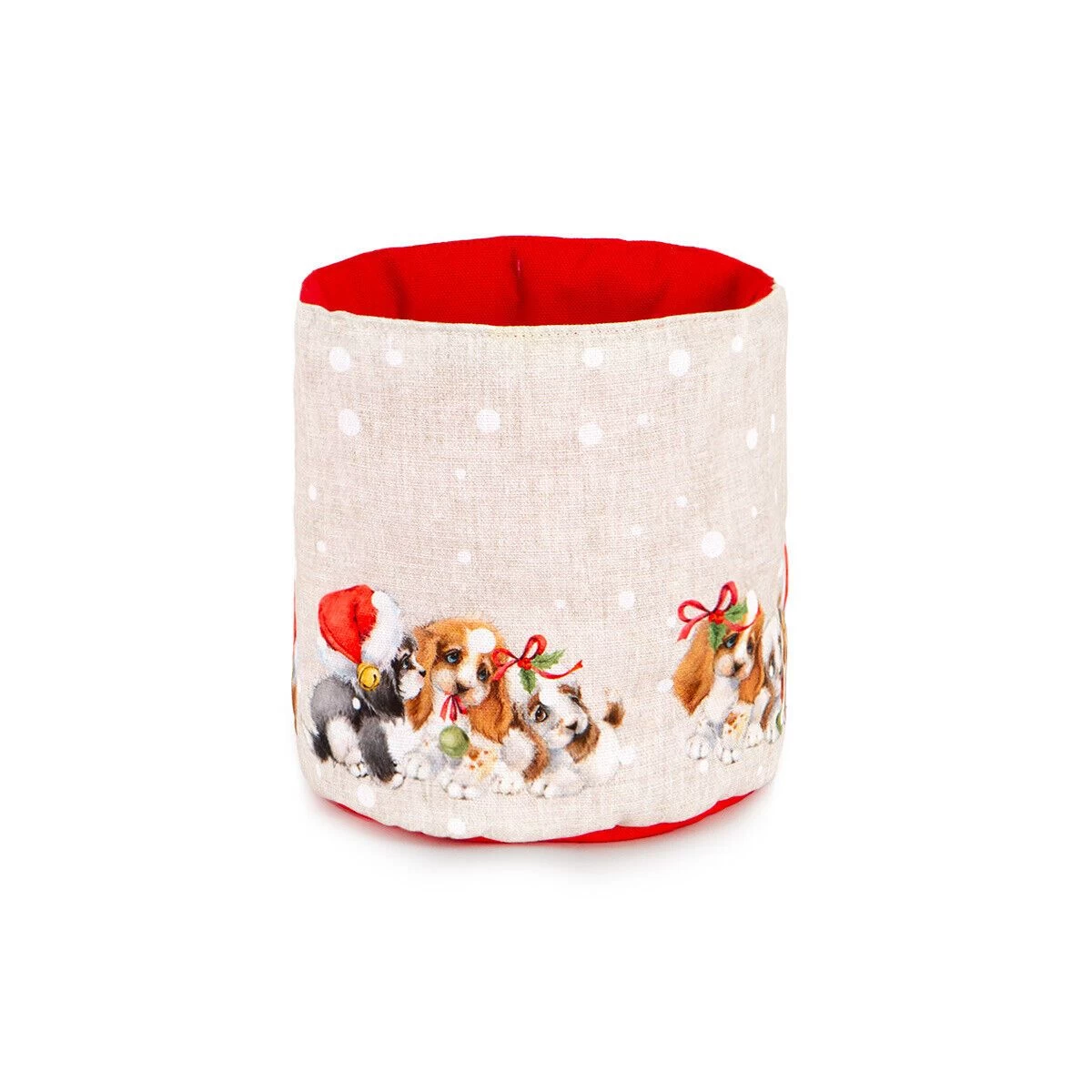 Per chi ama i cuccioli di cane e il Natale, Birillo è il cestino perfetto. La stampa in HD ad alta definizione rende il cestino adatto anche come addobbo festivo durante il Natale. Il portapane è realizzato in puro cotone.
