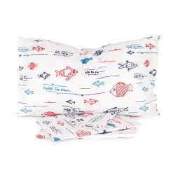 Il completo lenzuola Marline presenta una stampa con pesciolini colorati molto simpatica, con delle frasi ad effetto che ricordano il mare e l’estate “Let’s swim”.