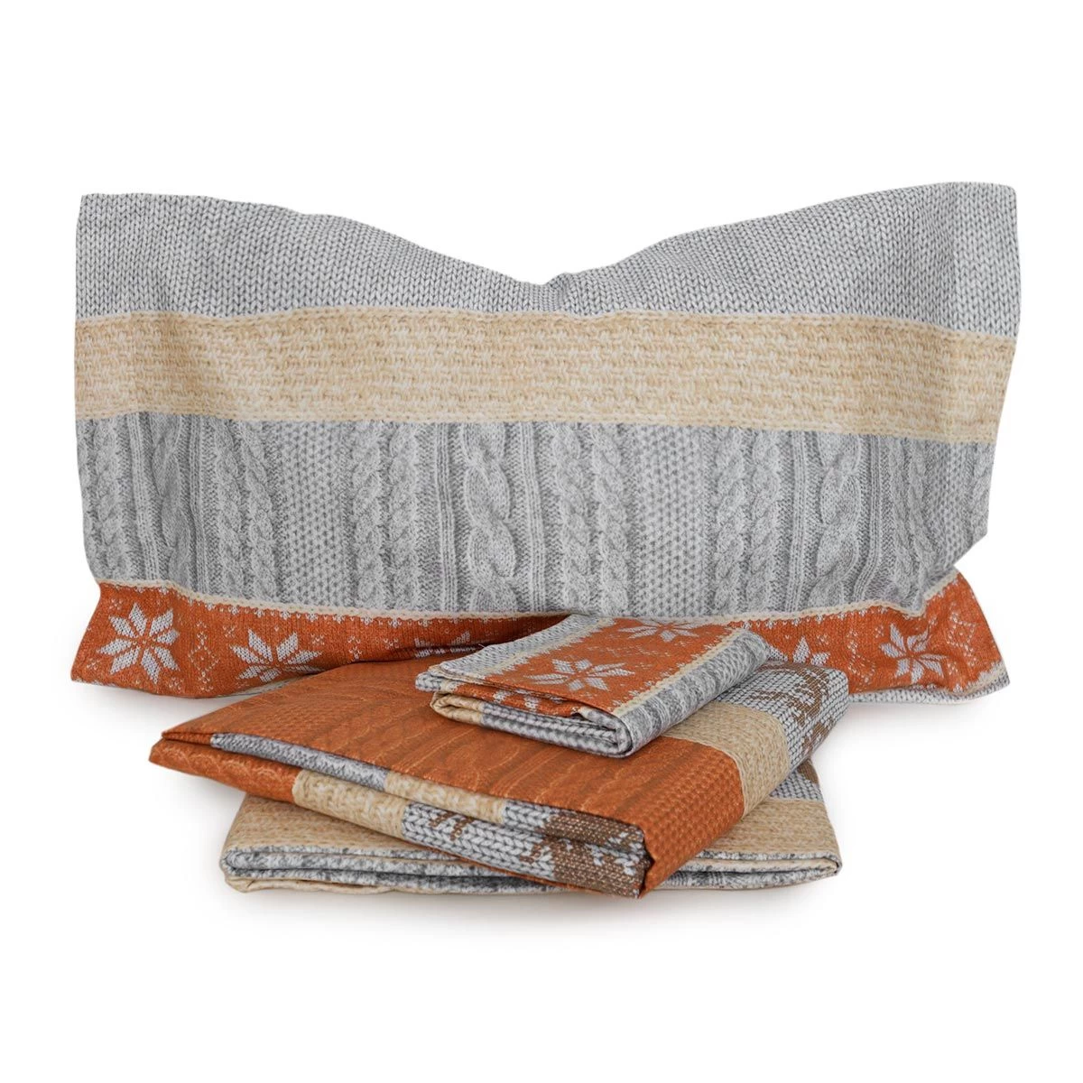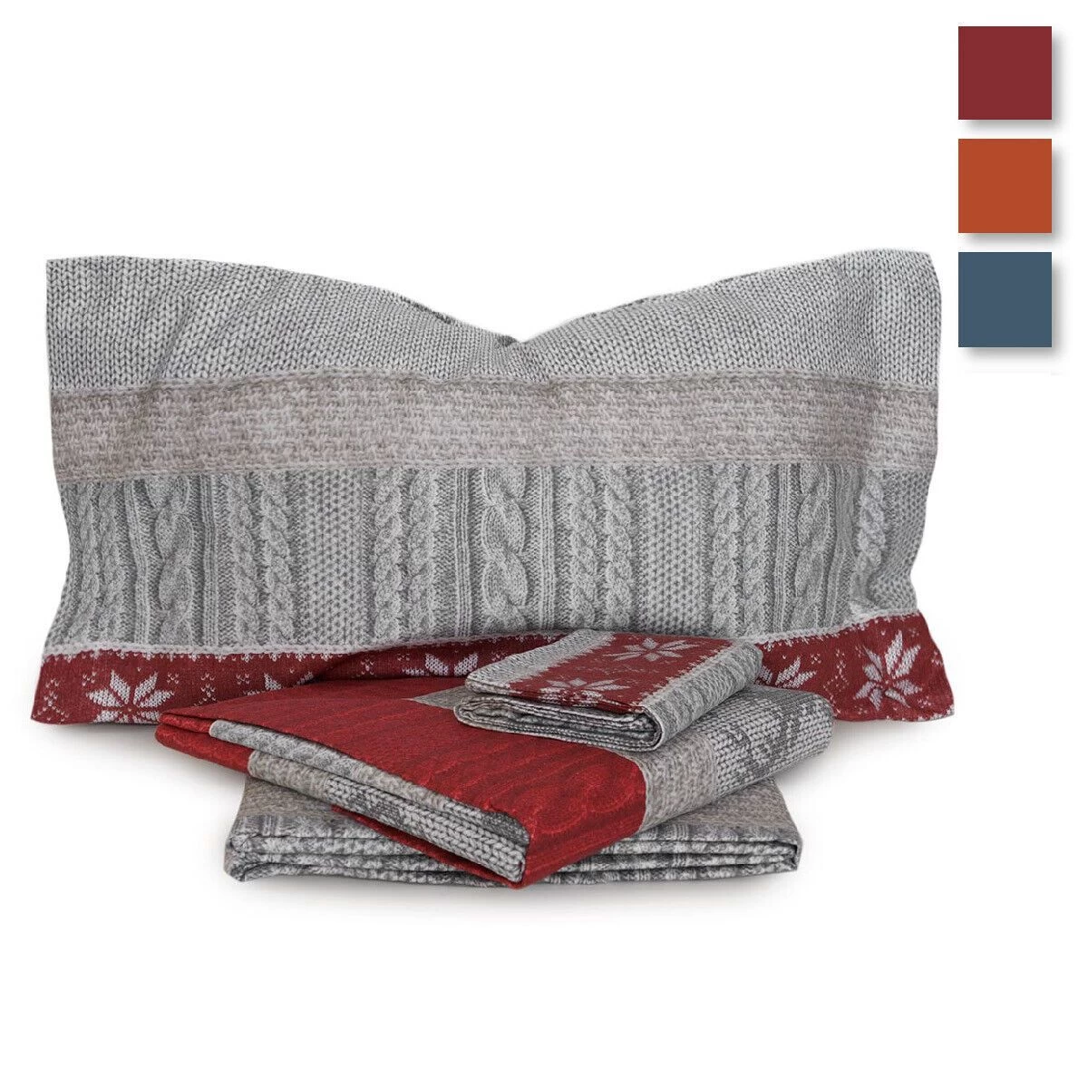 Il completo lenzuola Bald di Biancaluna realizzato in flanella di puro cotone, ha una stampa con motivo tricot ideale per l’inverno. Sarà come essere in una baita in montagna!