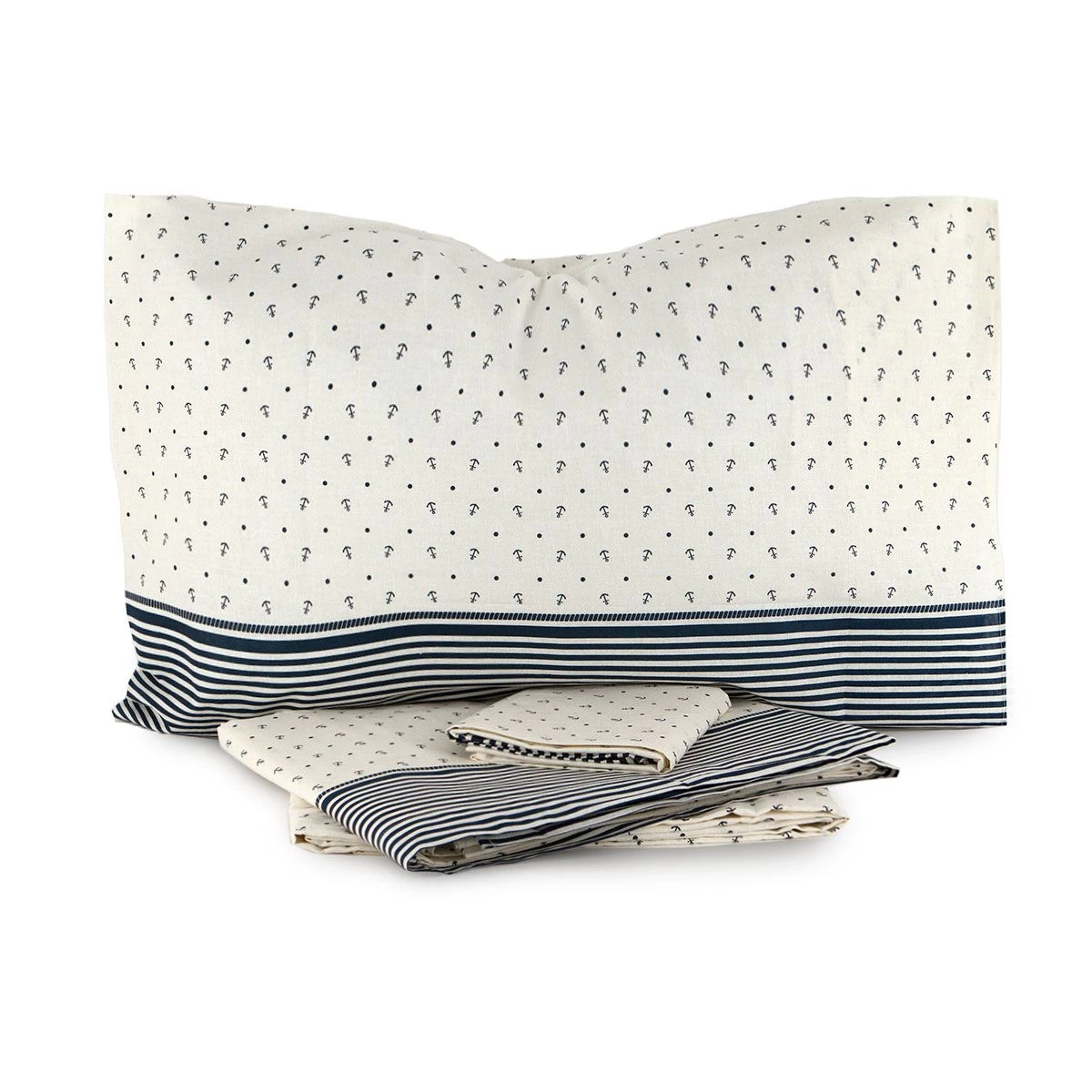 | Dettagli | La confezione contiene un completo lenzuola composto da: 1 lenzuolo sopra 1 lenzuolo sotto con angoli La dimensione per letto singolo ed una piazza e mezza comprende una federa, quella per letto matrimoniale comprende due federe Motivo marino Balza con motivo a righe Morbido e puro cotone naturale Made in Italy |