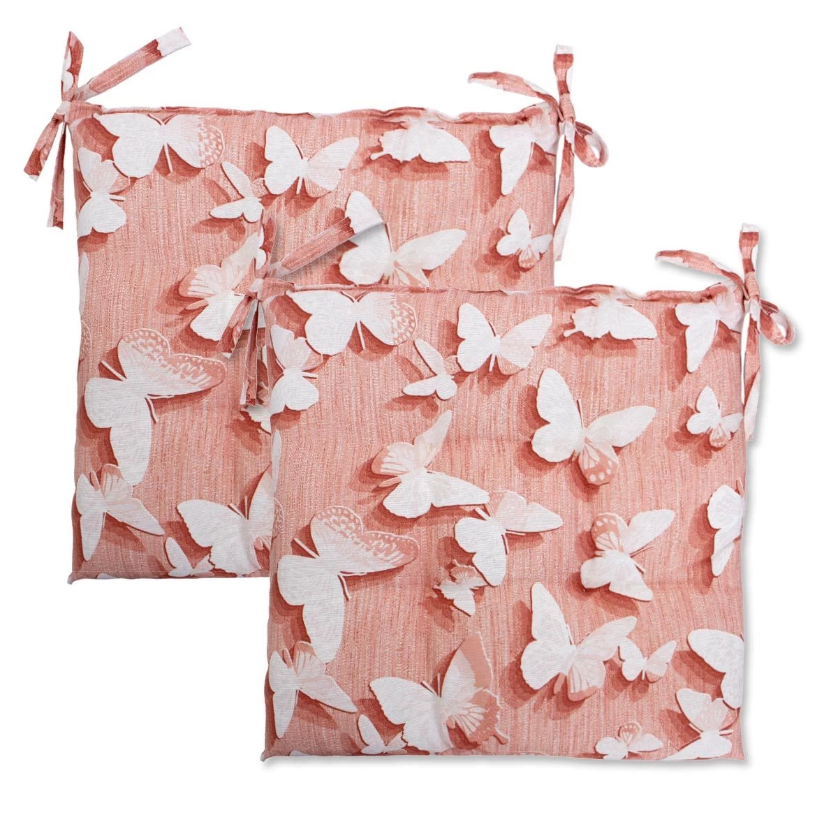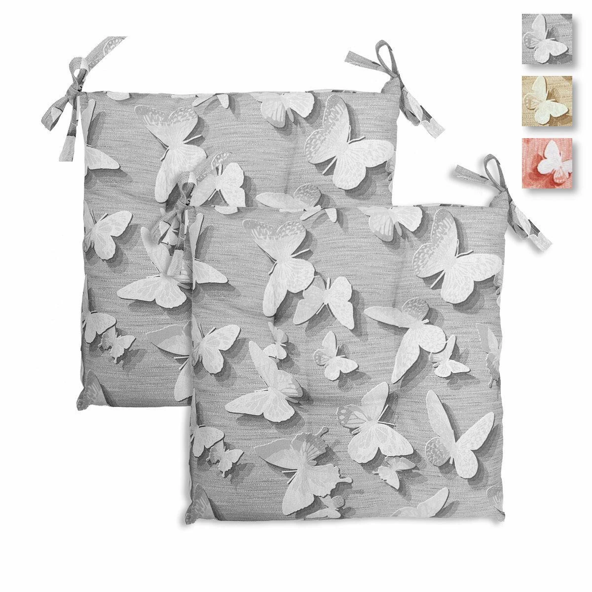 | Dettagli | La confezione comprende una coppia di cuscini coprisedia Forma quadrata Motivo con farfalle Trapuntatura con 4 punti a grana di riso Tessuto esterno loneta, spesso e consistente Imbottitura voluminosa e seduta confortevole Pratici laccetti in coordinato di colore che permettono una perfetta aderenza alla sedia Coordinabile con altri articoli Made in Italy |