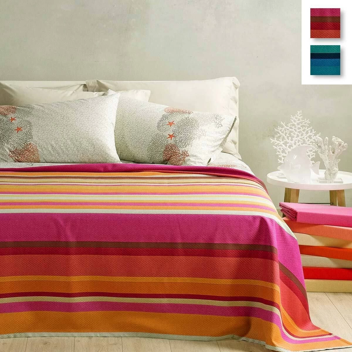 Ibiza è il copriletto leggero di Caleffi realizzato in piquet di puro cotone. Il motivo a righe lo rende un capo classico unito ai colori stravaganti, per chi vuole osare con lo stile in camera da letto.