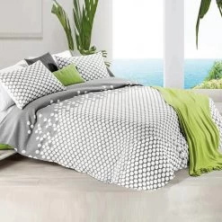 | Dettagli | La confezione contiene: 1 copriletto leggero per letto matrimoniale 2 fodere per cuscino con cerniera Motivo a pois in rilievo, doubleface Lavorazione jaquard Ideale per la primavera e l’estate Confezionato in scatola |