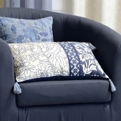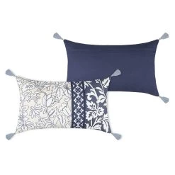| Dettagli | La confezione contiene un cuscino arredo Forma rettangolare Stampa bicolor con motivo floreale ornamentale Retro in tinta unita di colore blu marino Nappe applicate agli angoli Sfoderabile tramite cerniera Coordinabile con altri articoli |