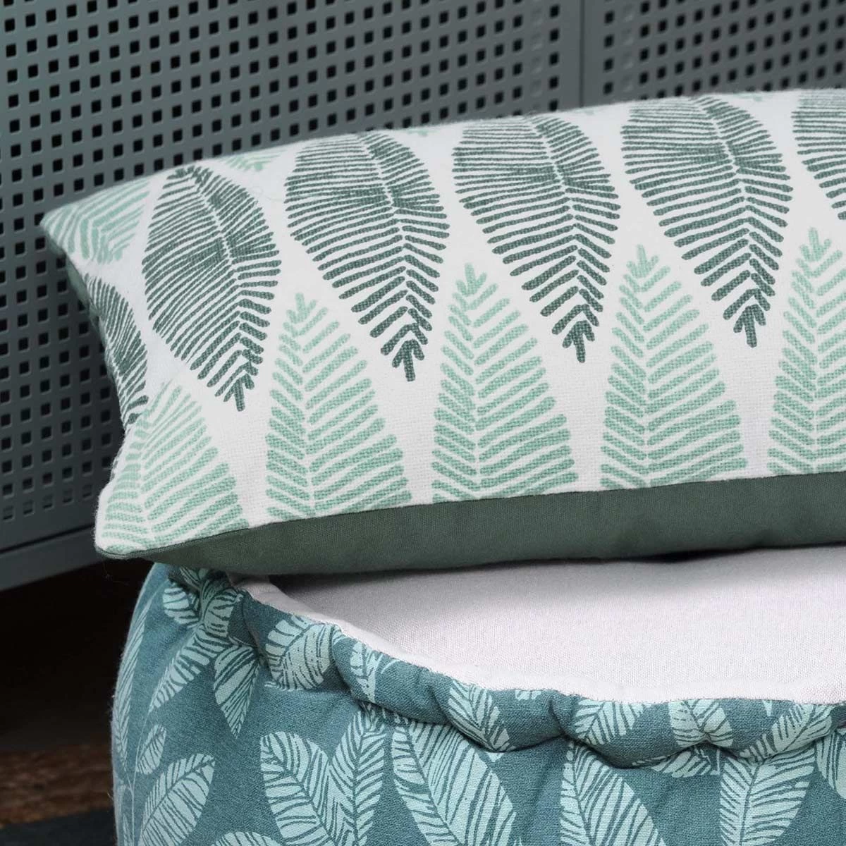 La fantasia con fogliame esotico rende il cuscino arredo Nashi di colore verde smeraldo un elemento essenziale in un ambiente living fresco e moderno.