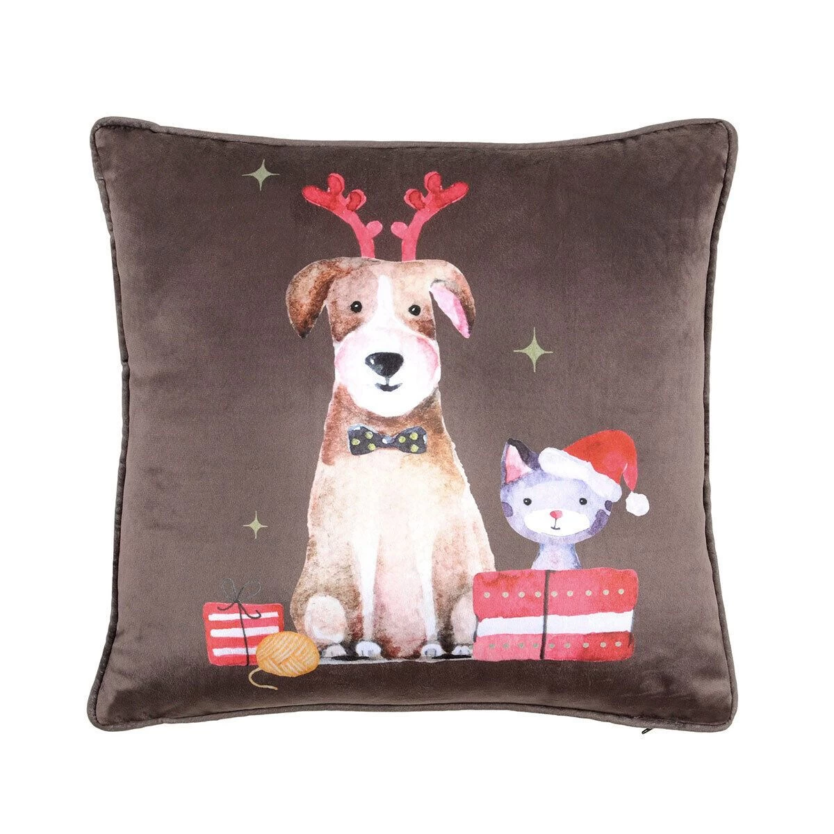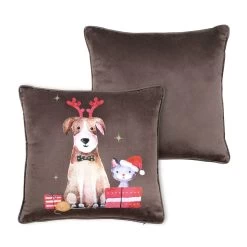 | Dettagli | La confezione contiene un cuscino arredo Forma quadrata Motivo natalizio Stampa di un cane ed un gattino Retro in tinta unita marrone Bordino a coda di topo Sfoderabile, tramite cerniera Imbottitura inclusa |