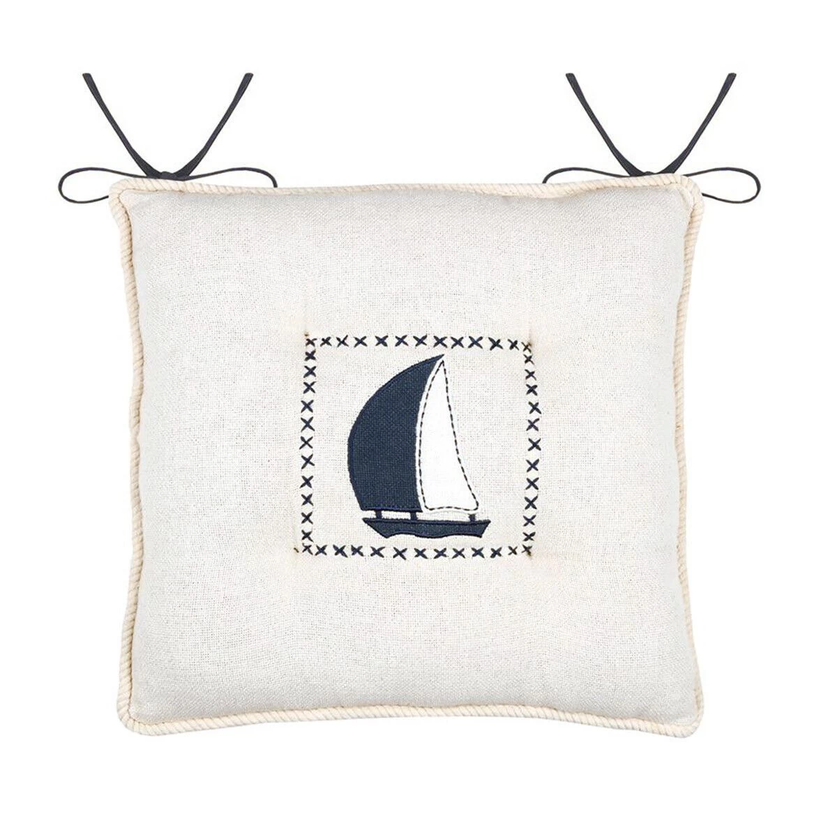 | Dettagli | La confezione contiene un cuscino coprisedia Forma quadrata Motivo marino con ricamo di una barca a vela Retro in tinta unita Bordino perimetrale con corda intrecciata Trapuntatura con 4 punti a grana di riso Imbottitura e seduta confortevole Pratici laccetti che permettono una perfetta aderenza alla sedia Non sfoderabile |