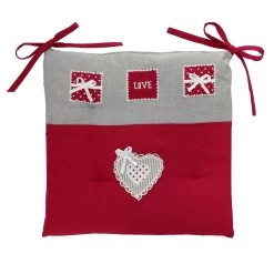 | Dettagli | La confezione contiene un cuscino coprisedia Motivo country con cuori e scritta love ricamati Forma quadrata Laccetti agli angoli superiori in coordinato di colore che permettono una perfetta aderenza alla sedia Imbottitura consistente e voluminosa Coordinabile con gli altri articoli della linea Vèrone |