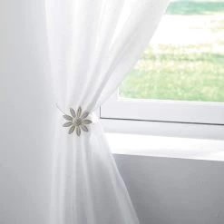 | Dettagli | La confezione contiene un fermatenda in metallo Forma a fiore Dotato di chiusura tramite calamita con laccio Metallo sagomato e levigato Ideale per raccogliere le tende o creare drappeggi |