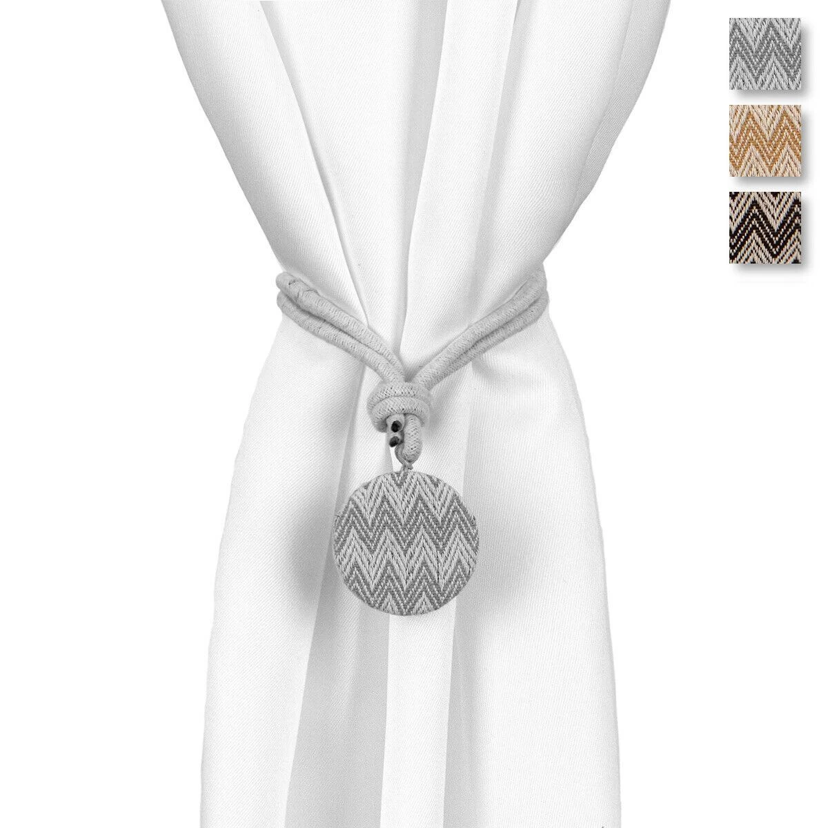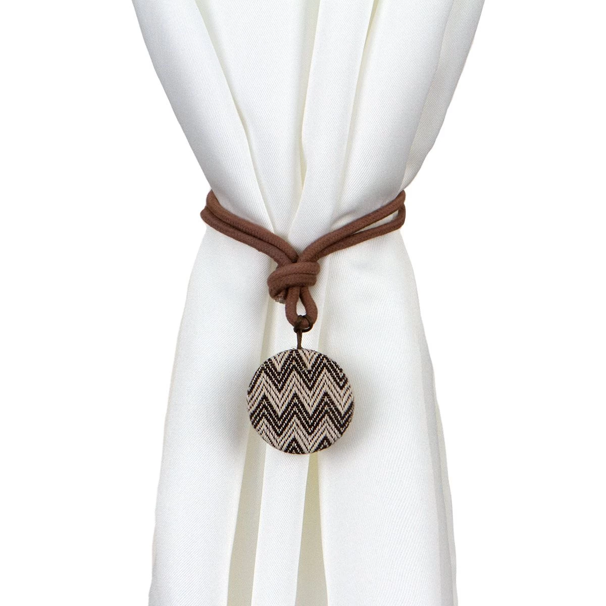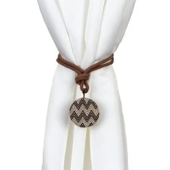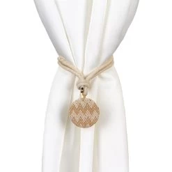 | Dettagli | La confezione contiene un fermatenda composto da: 1 nastro/laccio in corda intrecciata 1 decoro rotondo in metallo rivestito in tessuto con motivo a zig zag Chiusura con asola Ideale per raccogliere le tende o creare drappeggi |