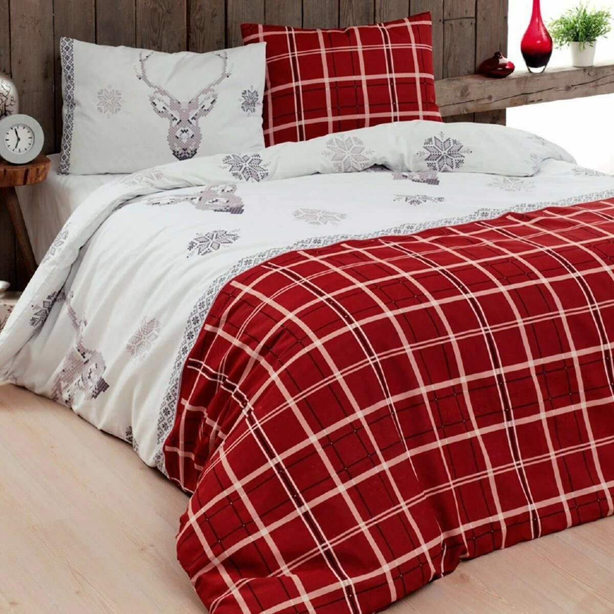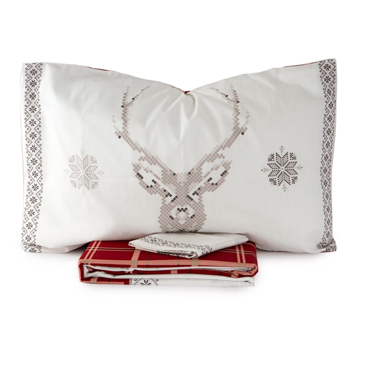 La parure copripiumino Verney della collezione Infinity di Daunex presenta uno stile tipicamente invernale: nella parte superiore sono rappresentati cervi e fiocchi di neve in stile mosaico, nella parte inferiore una stampa con quadri di colore rosso.