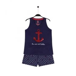 | Dettagli | La confezione contiene un pigiama per bambina/ragazza estivo composto da: 1 canotta spalla larga girocollo con stampa centrale con paillettes di un’ancora e scritta “la vie est belle” ricamata 1 pantaloncino corto motivo marino con ancore con elastico in vita Cotone jersey, fresco e leggero Confezionato in una scatola stampata |