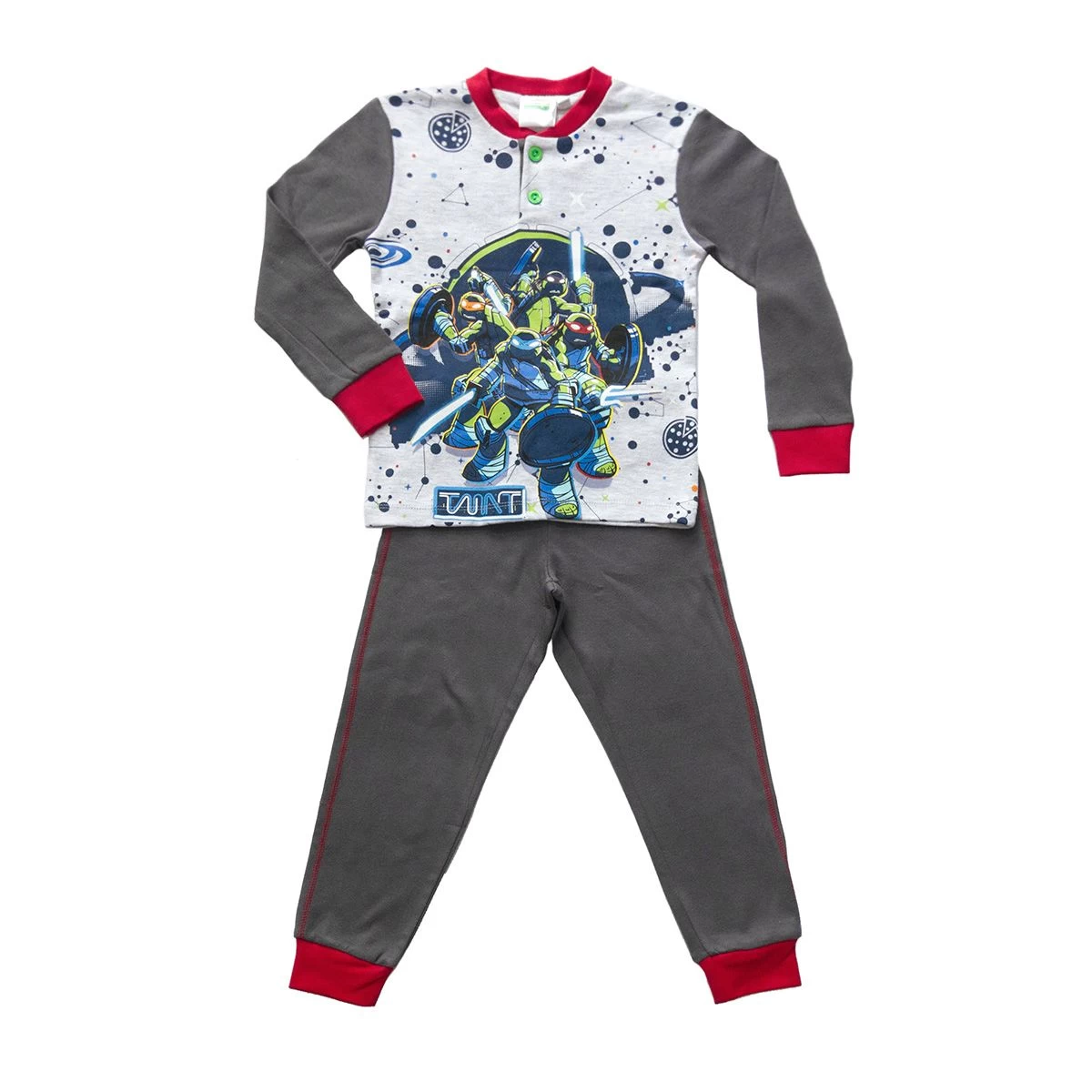 | Dettagli | La confezione contiene un pigiama per bambino composto da: 1 maglia con scollo serafino stampata con polsini elasticizzati e maniche a contrasto 1 pantalone tinta unita con elastico e polsini a contrasto Stampa con le Trartarughe Ninja  Morbido caldo cotone adatto al periodo invernale Prodotto dalla licenziataria ufficiale del marchio |