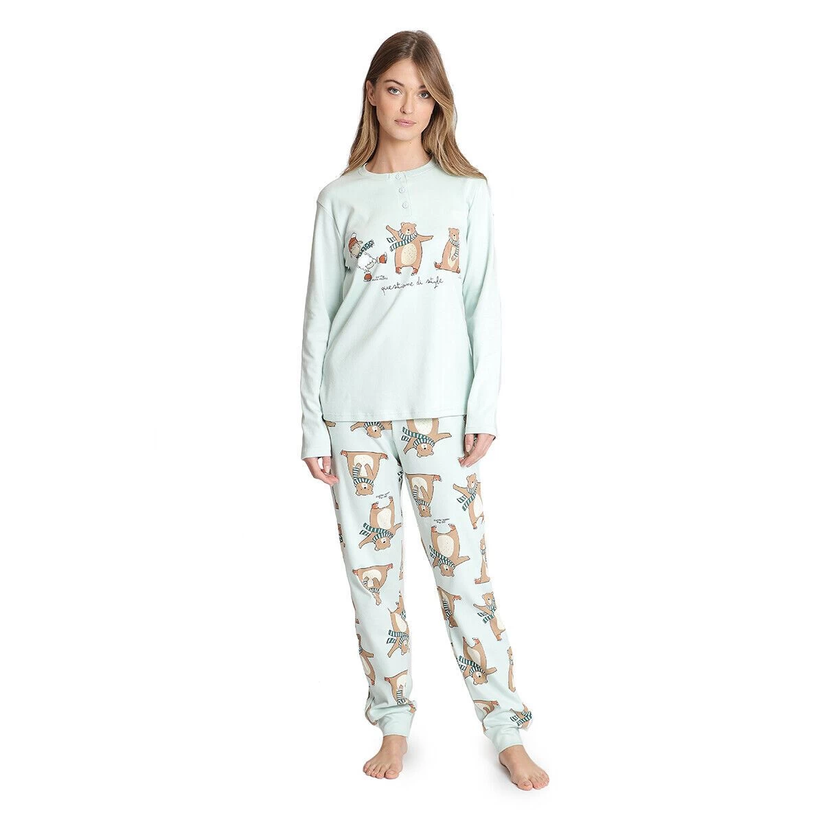 | Dettagli | La confezione contiene un pigiama per donna composto da: 1 maglia manica lunga, collo serafino e stampa centrale 1 pantalone lungo con la stampa dell’orsetto di Happy People, elastico in vita 1 sacchetto porta pigiama Comodo e pratico Caldo e soffice cotone Ideale per il periodo invernale |