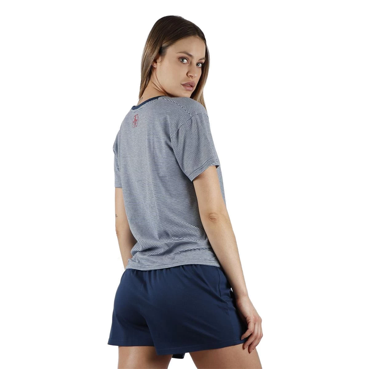 | Dettagli | La confezione contiene un pigiama da donna composto da: 1 maglia a mezza manica girocollo con stampa centrale a righe 1 pantalone corto in tinta unita blu con elastico in vita Cotone fresco e leggero Confezionato in una scatola stampata |