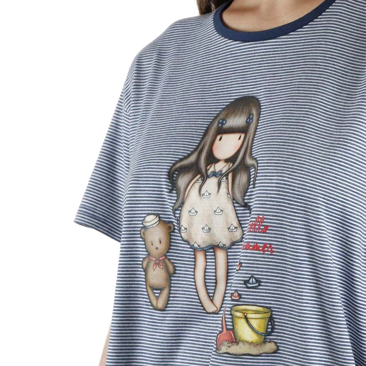 “Hello Summer”, la bambolina di Gorjuss gioca con paletta e secchiello sulla spiaggia. Questo pigiama da donna è ideale per l’estate.