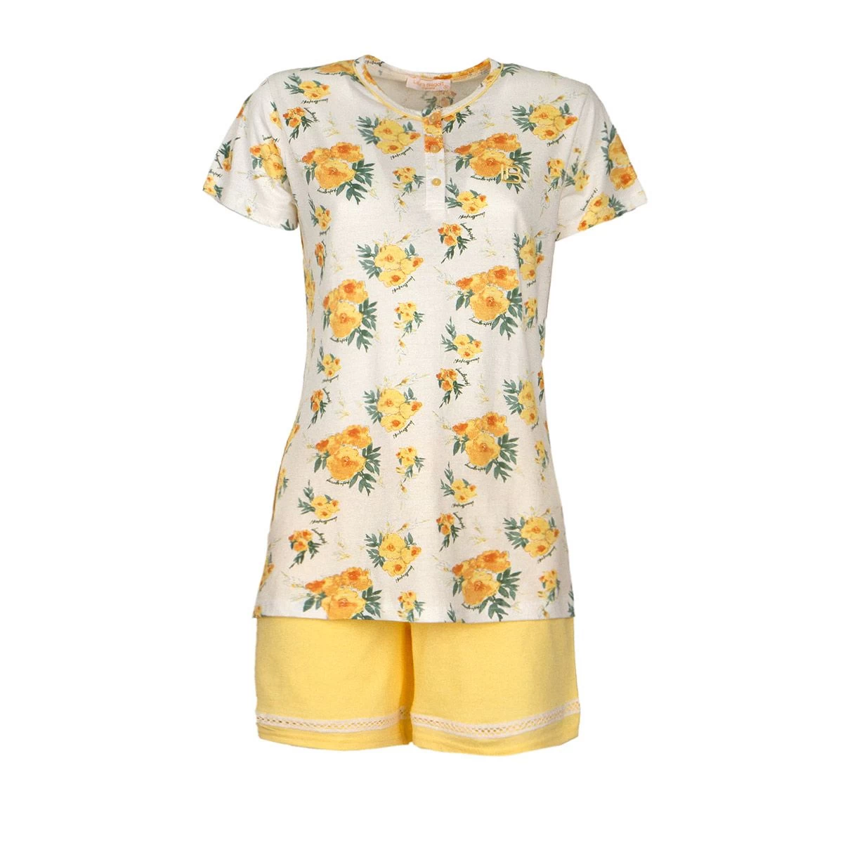 | Dettagli | La confezione contiene un pigiama da donna composto da: 1 maglia a mezza manica con girocollo serafino con 3 bottoncini 1 pantaloncino corto tinta unita con elastico in vita Maglia con motivo floreale e dettaglio ricamato Jersey di cotone, fresco e leggero Confezionato in una scatola stampata Styled in Italy |