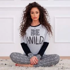 Oronero presenta un pigiama dal design classico, spezzato dalla freschezza selvaggia di un motivo zebrato che va a incorniciare la stampa centrale, rifinita con strass, che racchiude l’essenza del suo stile: “Be Wild”. Il pigiama è realizzato in caldo cotone, perfetto per le temperature invernali.