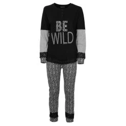| Dettagli | La confezione contiene un pigiama da donna composto da: 1 maglia manica lunga girocollo serafino e stampa centrale con strass 1 pantalone lungo con elastico in vita Maglia e pantalone hanno i polsini elasticizzati Maglia con bordo in pizzo Pantalone, polsini e stampa in motivo zebrato Caldo cotone ideale per il periodo invernale Confezionato in una scatola stampata |