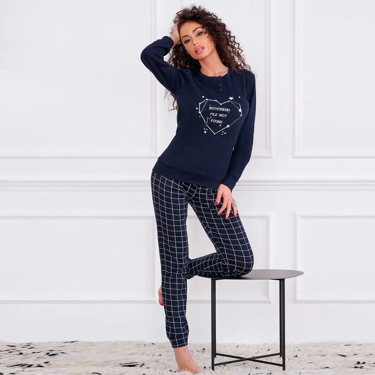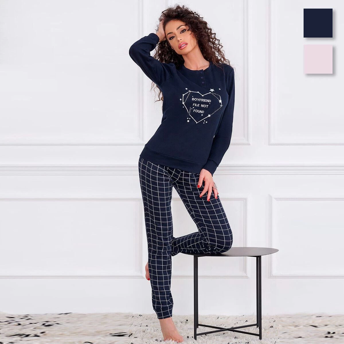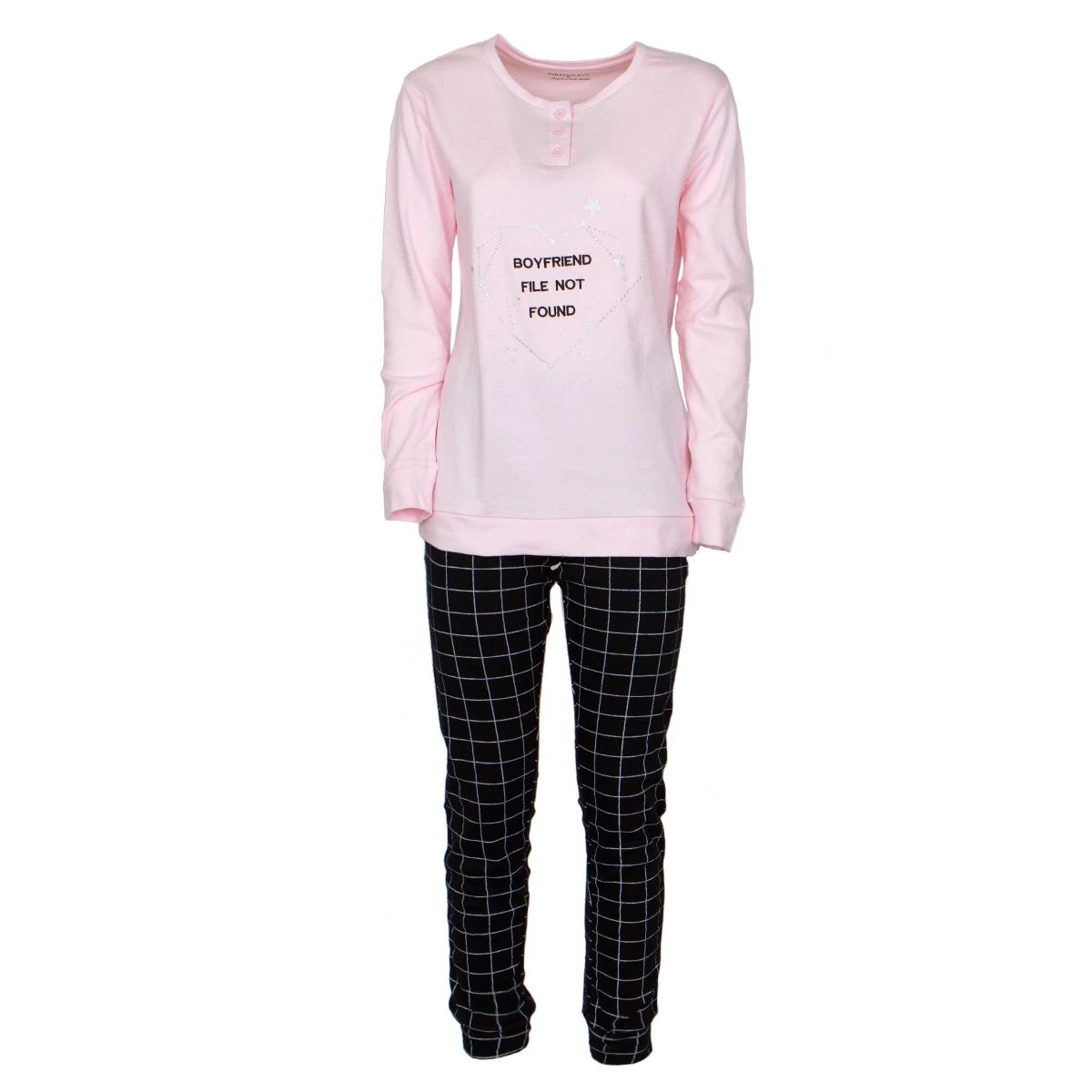 | Dettagli | La confezione contiene un pigiama da donna composto da: 1 maglia manica lunga girocollo serafino con stampa centrale 1 pantalone lungo con elastico in vita Maglia e pantalone hanno i polsini elasticizzati Pantalone con motivo a quadri Caldo cotone ideale per il periodo invernale Confezionato in una scatola stampata |
