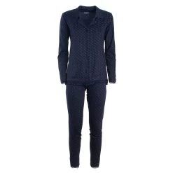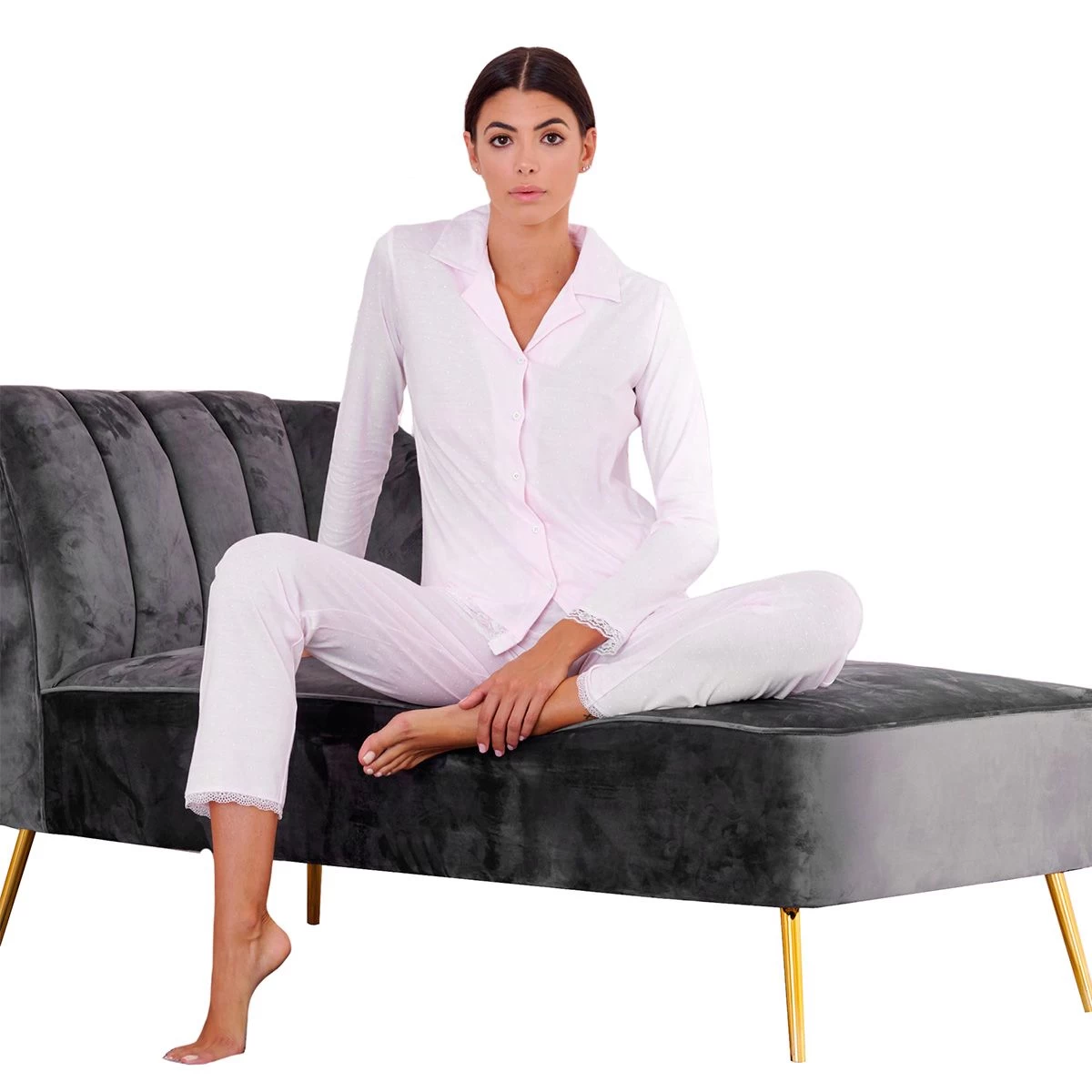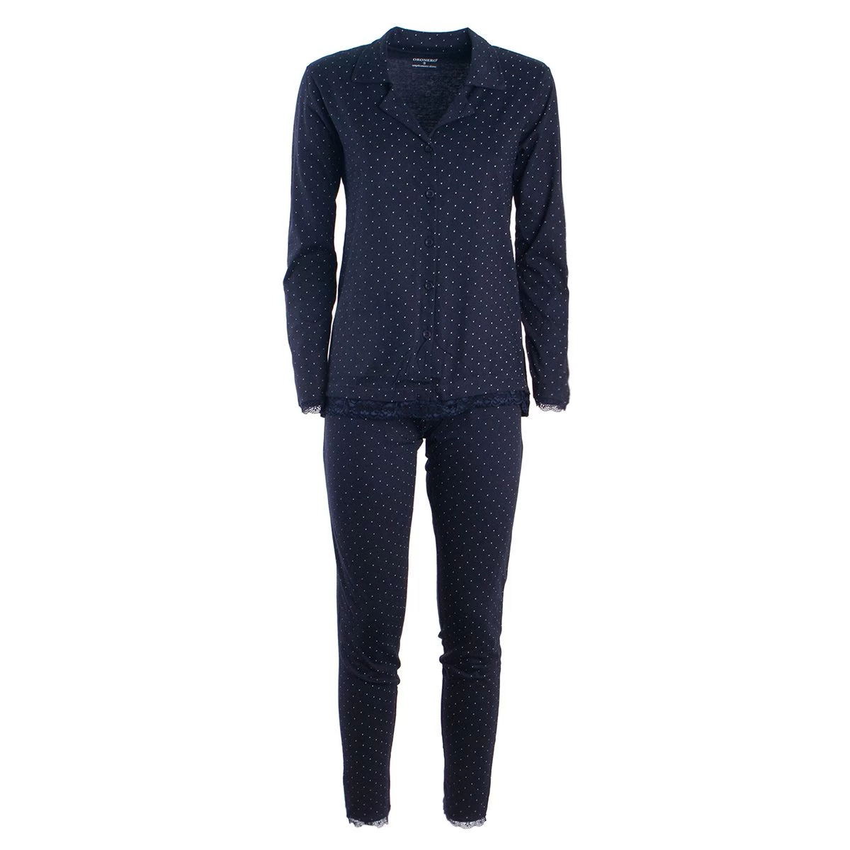 | Dettagli | La confezione contiene un pigiama da donna composto da: 1 maglia a manica lunga aperta con scollo a bavero 1 pantalone lungo tinta unita con elastico in vita Inserti in pizzo Jersey di cotone, fresco e leggero Adatto per la primavera, l’estate e l’autunno Confezionato in una scatola stampata |