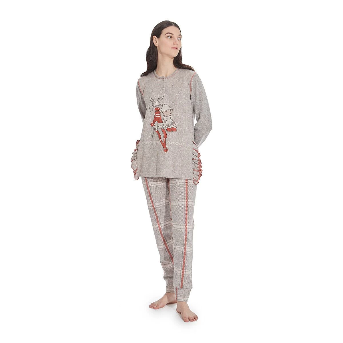 | Dettagli | La confezione contiene un pigiama per donna composto da: 1 maglia manica lunga, collo serafino e stampa centrale 1 pantalone lungo a quadri, elastico in vita Maglia e pantalone dotati di polsini elasticizzati Maglia dotata di spacchi laterali con rouches applicate Comodo e pratico Morbido e caldo punto milano, ideale per il periodo invernale |