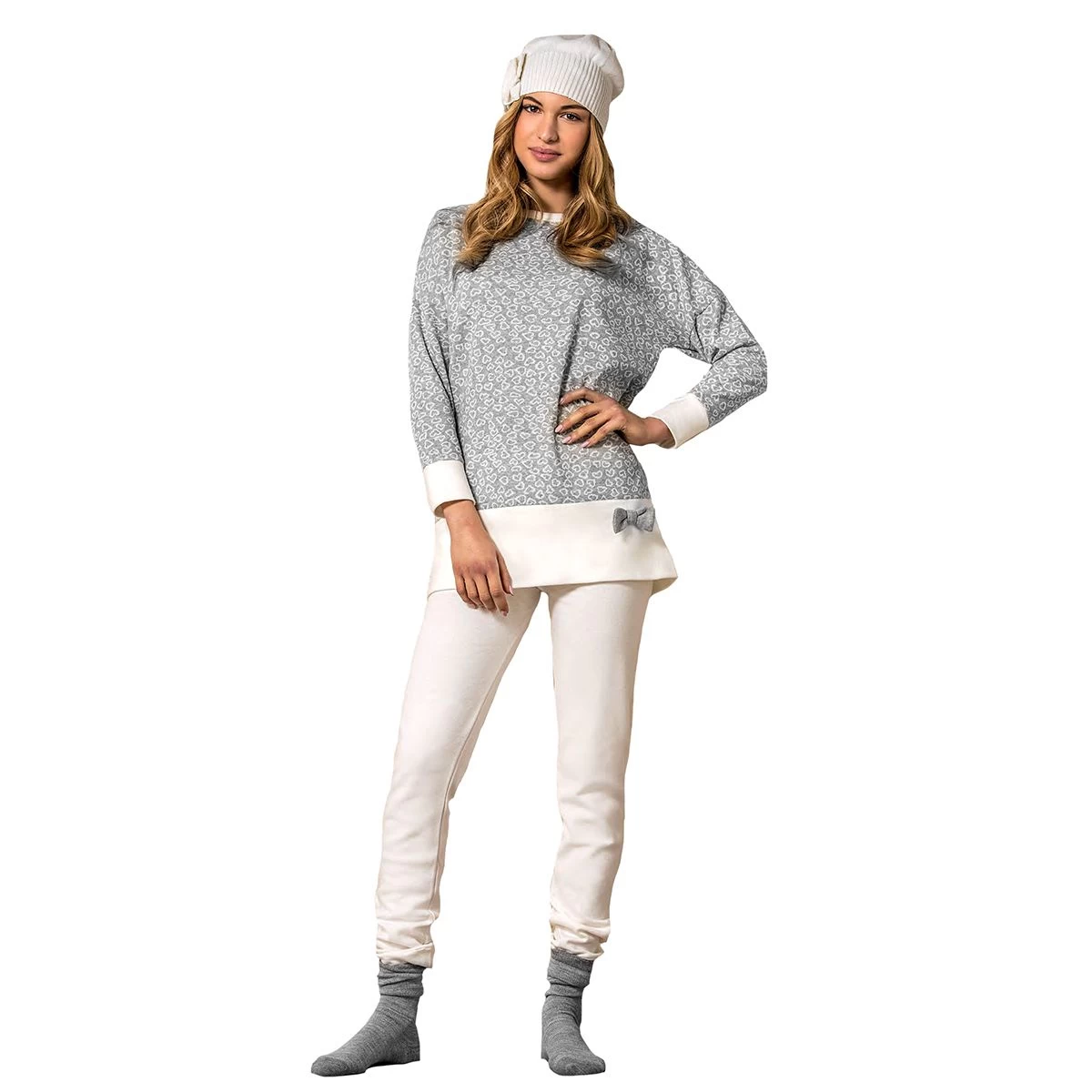 | Dettagli | La confezione contiene un pigiama da donna composto da: 1 maxi maglia a manica lunga scollo serafino, comodi polsini elasticizzati, fiocchetto applicato 1 pantalone lungo tinta unita, aderente con polsini elasticizzati Punto Milano a maglia rasata, particolarmente compatta e calda Morbido e soffice Ideale per il periodo invernale Confezionato in una scatola stampata |