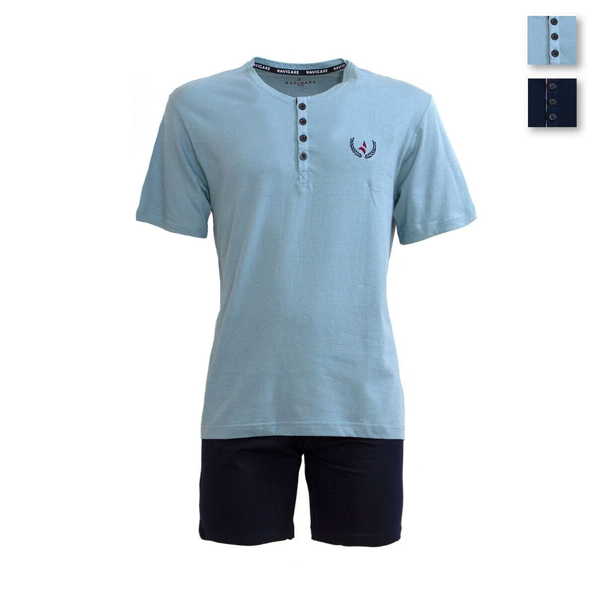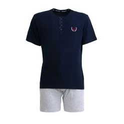 | Dettagli | La confezione contiene un pigiama per uomo composto da: Una maglia a mezza manica girocollo serafino con bottoncini Logo ricamato sul petto Un pantalone corto in tinta unita con elastico in vita in contrasto di colore Jersey di cotone Capo estivo leggero e comodo Confezionato in una scatola stampata |