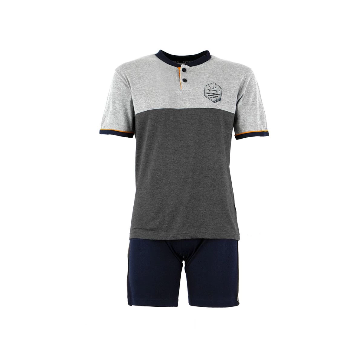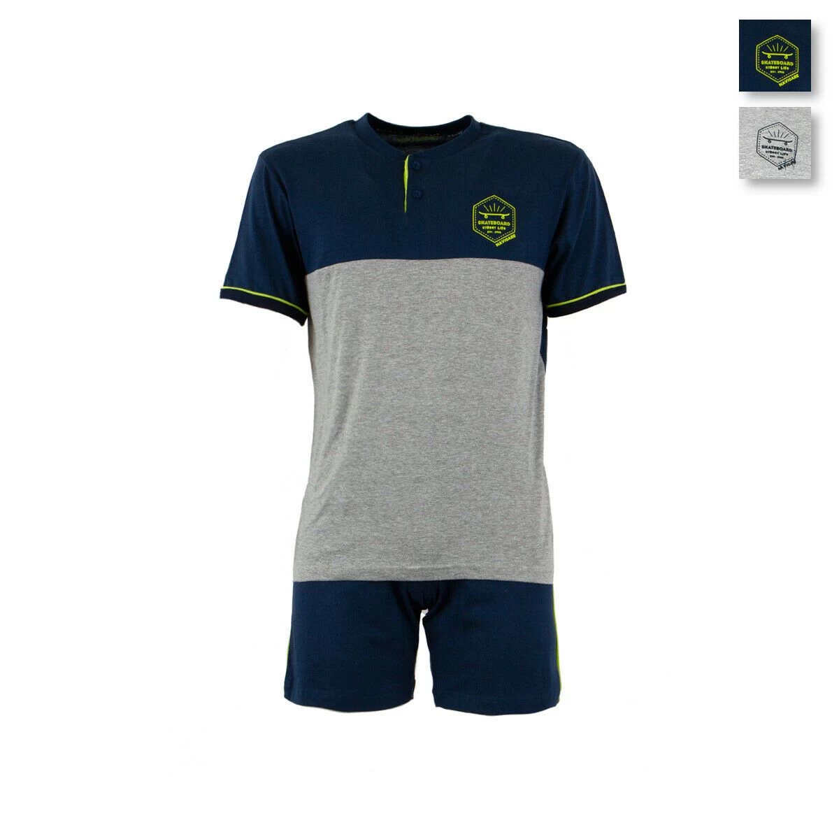 | Dettagli | La confezione contiene un pigiama da ragazzo composto da: Una maglia a mezza manica, scollo serafino Logo stampato sul petto Un pantalone corto tinta unita con elastico in vita e taschino posteriore Jersey di cotone Capo estivo leggero e comodo Confezionato in una scatola stampata |