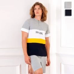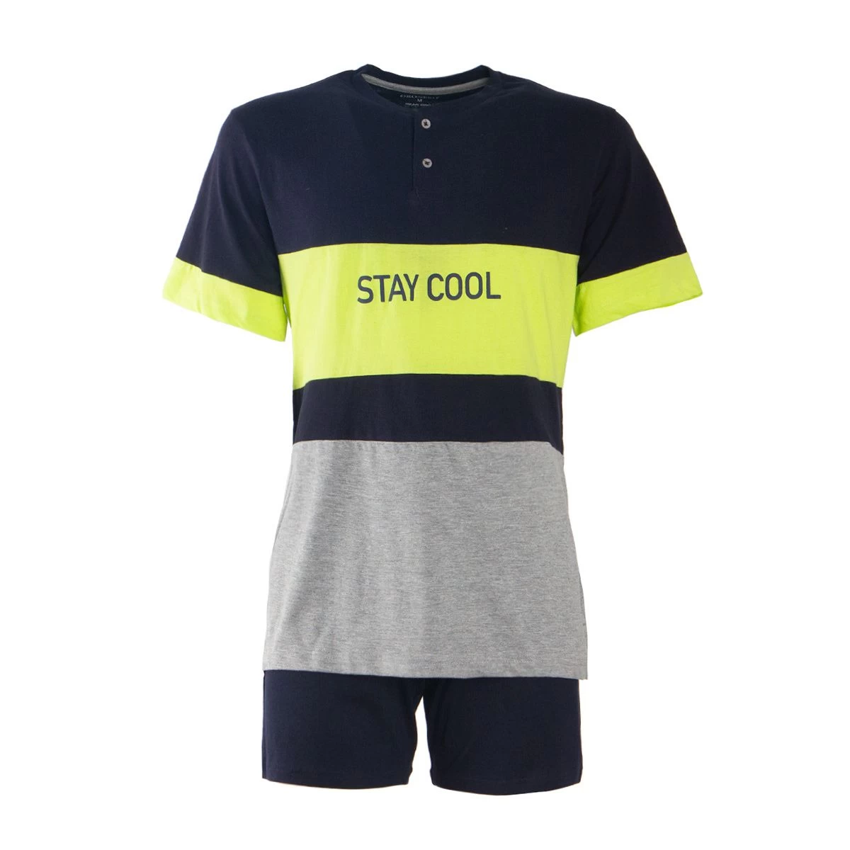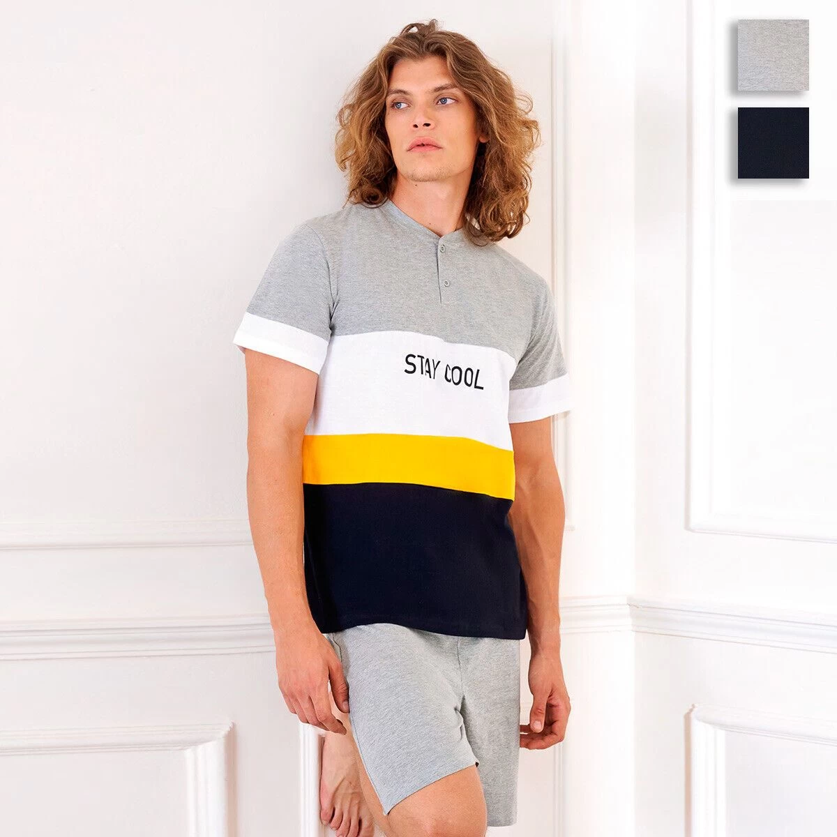 | Dettagli | La confezione contiene un pigiama da uomo estivo composto da: 1 maglia a mezza manica scollo serafino 1 pantaloncino corto con laccio regolabile in vita Jersey di puro cotone, fresco e leggero Confezionato in una scatola stampata |