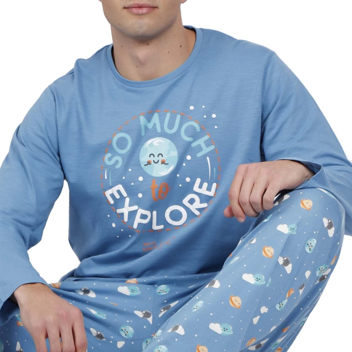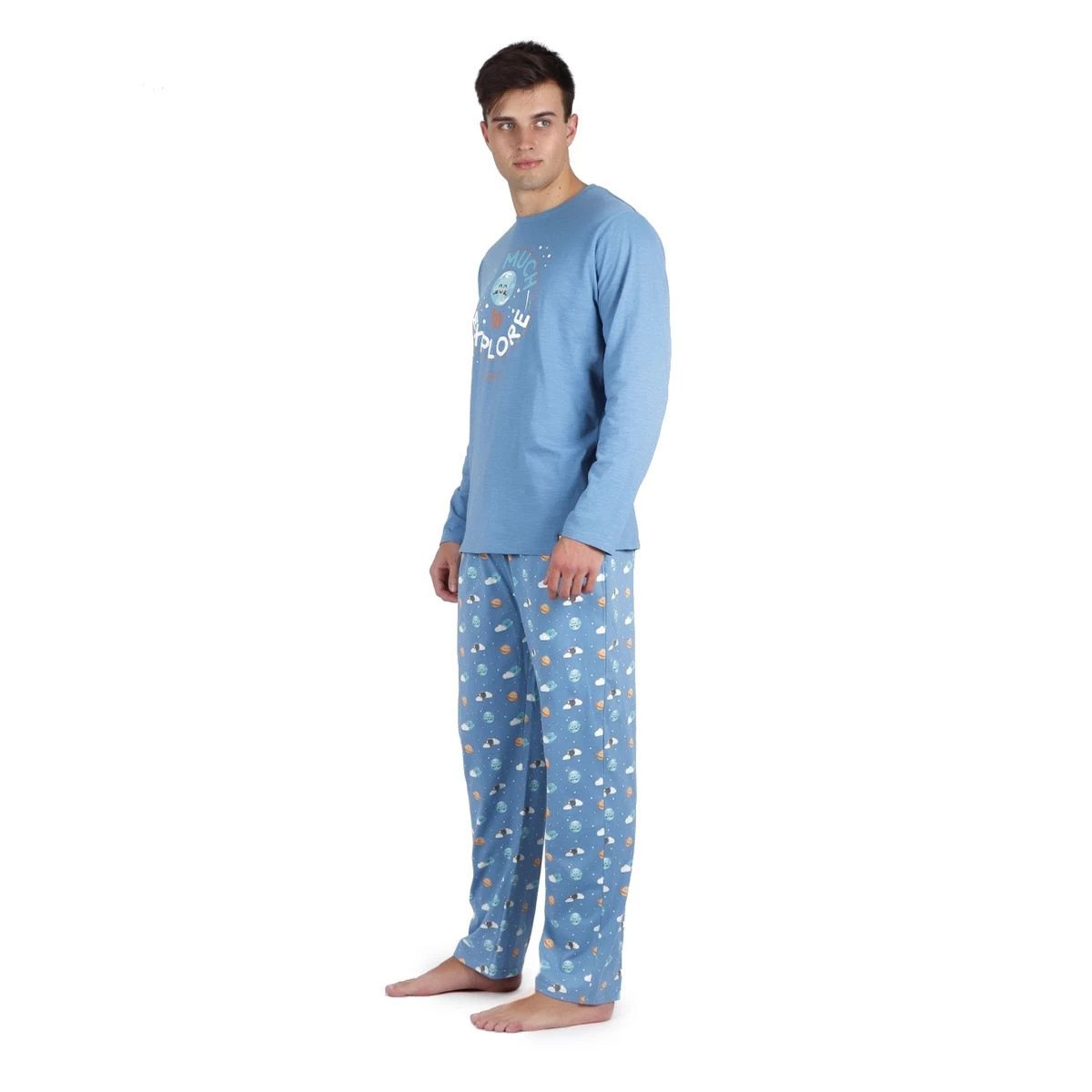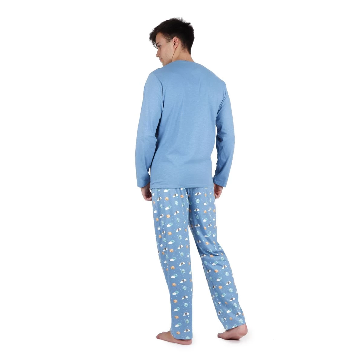 | Dettagli | La confezione contiene un pigiama da uomo composto da: 1 maglia girocollo a manica lunga con stampa centrale 1 pantalone lungo a fantasia con pianeti con elastico in vita e laccio regolabile Jersey di puro cotone, fresco e leggero Adatto per la primavera, l’estate e l’autunno Confezionato in una scatola stampata |