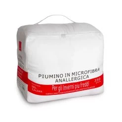 | Dettagli | La confezione contiene un piumino invernale Fodera ed imbottitura in microfibra anallergica Trapuntatura a cassettoni Peso: 350 gr/mq Ideale per il periodo invernale Anallergico, pratico e comodo Prodotto contenuto in un comodo sacco in tessuto con cerniera e manico |