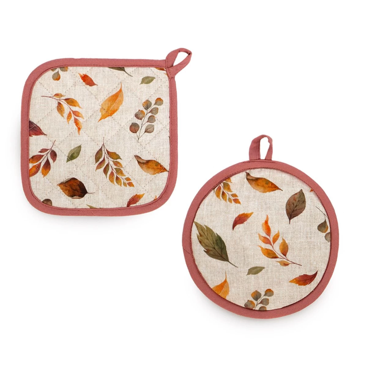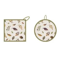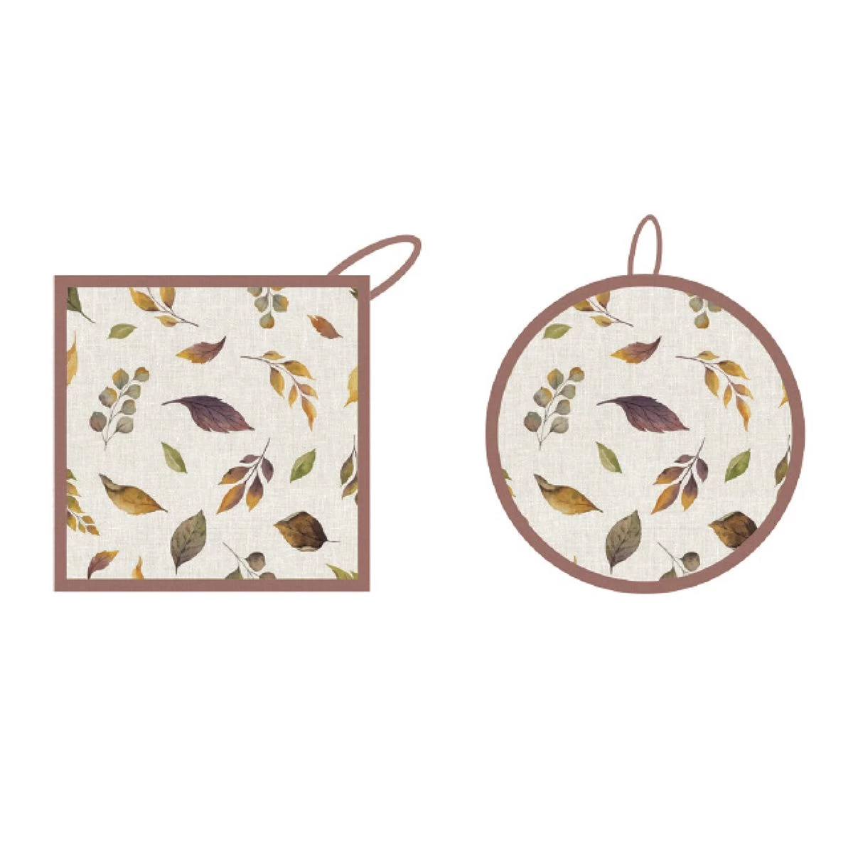 Con il set di presine Margaret l’autunno prende vita nella tua cucina. La stampa digitale raffigura tante foglie dalle sfumature autunnali, conferendo un tocco di stile a questi pratici accessori.
