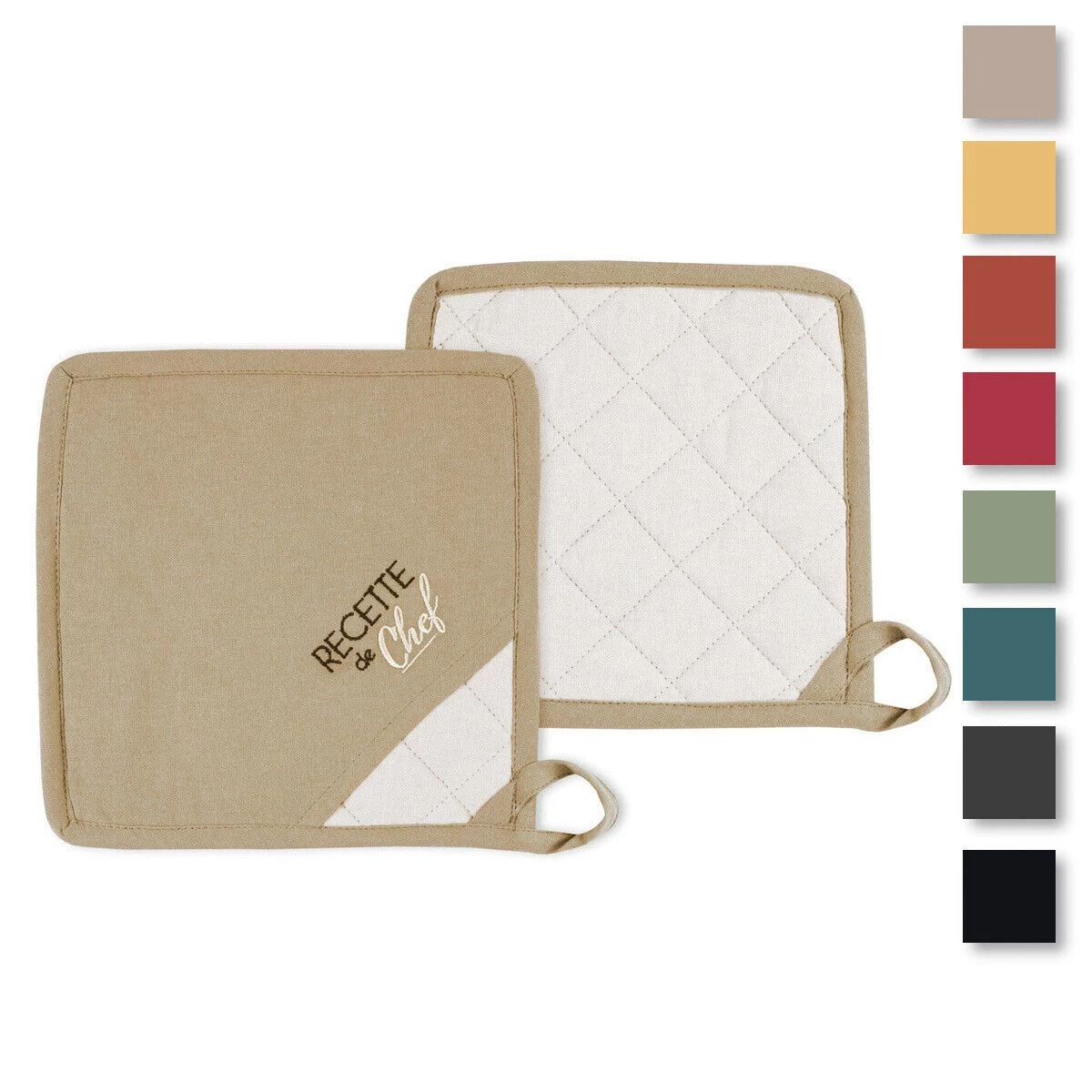 | Dettagli | La confezione contiene un set di presine Forma quadrata La presina più grande è dotata di tasca e scritta ricamata “Recette de Chef” Dotate di appendino Puro cotone, resistente ai numerosi lavaggi |