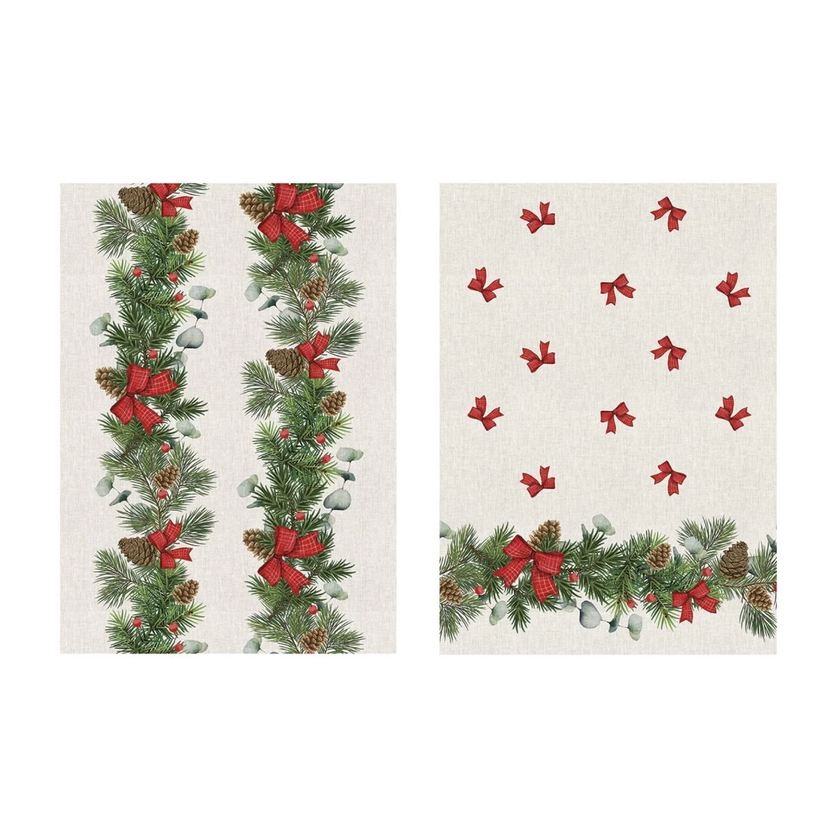 Il set di strofinacci Chalet è composto da due pezzi che uniscono nel loro design, realizzato con stampa digitale ad alta definizione, la dolcezza delle decorazioni natalizie, richiamate con fiocchi e addobbi, e la raffinatezza del motivo tartan. I canovacci sono realizzati in puro cotone.