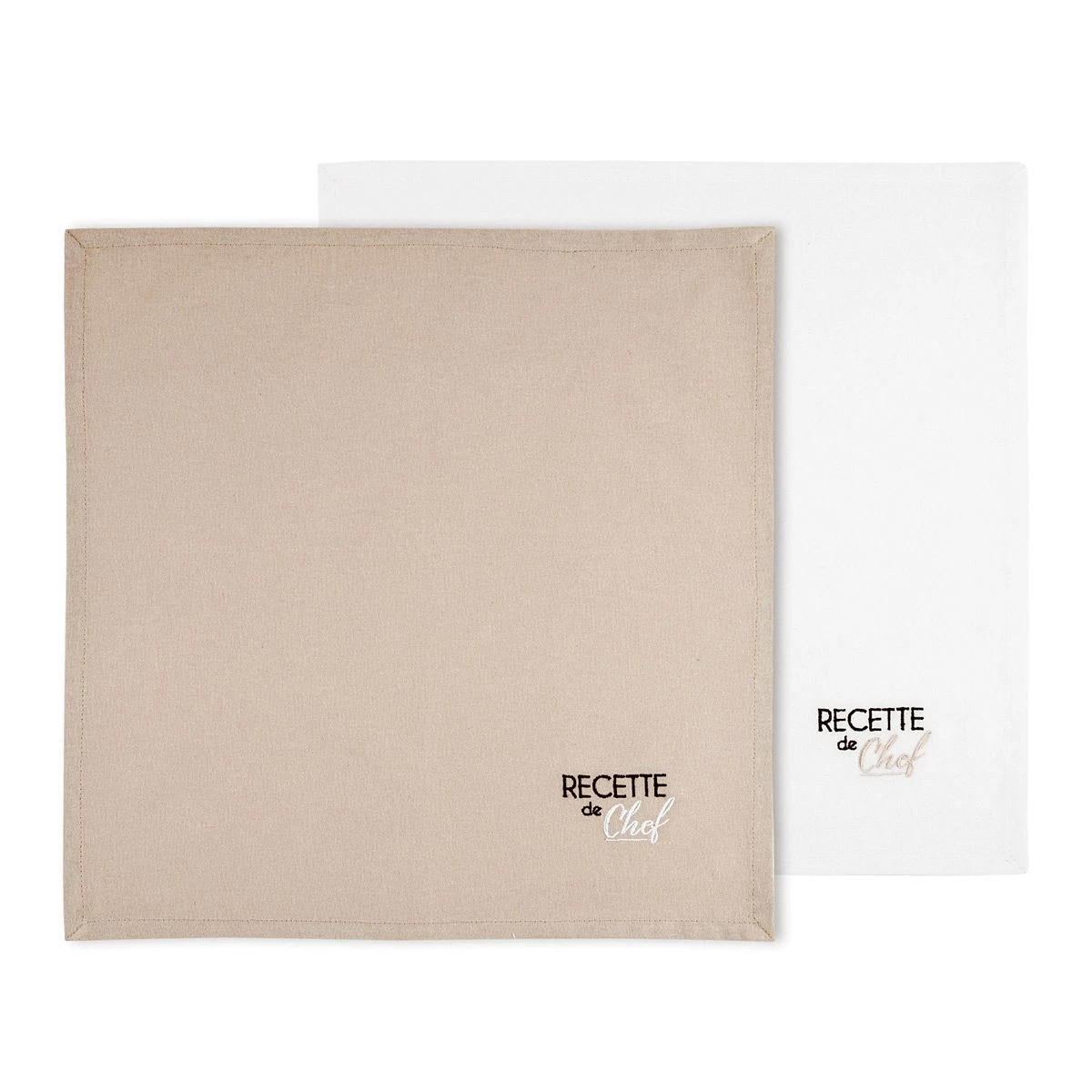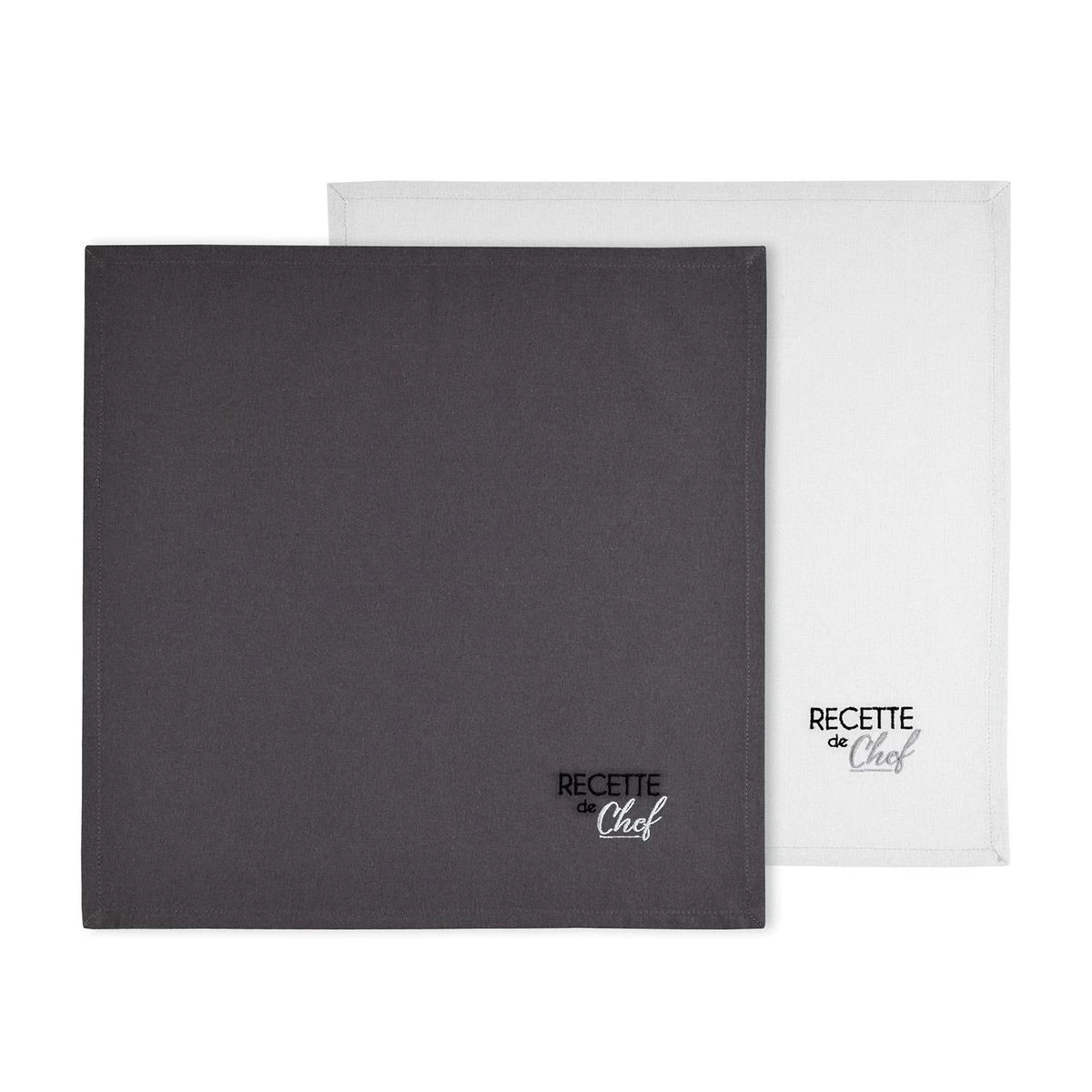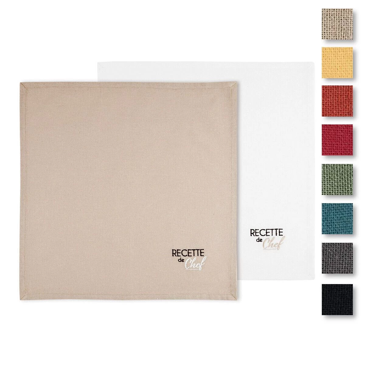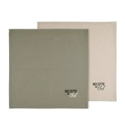 | Dettagli | La confezione contiene un set di tovaglioli Forma quadrata Tinta unita con scritta ricamata “Recette de Chef” Un tovagliolo colorato e l’altro più chiaro in contrasto Puro cotone, resistente ai numerosi lavaggi |