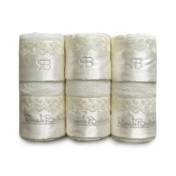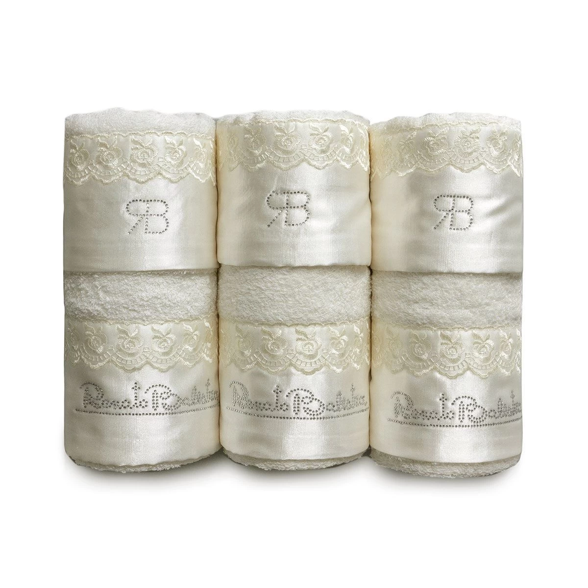 | Dettagli | La confezione contiene un set di asciugamani da 6 pezzi composto da: 3 asciugamani viso 3 asciugamani ospite Bordo in raso con applicazione in pizzo operato Logo Renato Balestra brillantinato con strass swarovski Tessuto di prima qualità Confezionamento artigianale Prodotto confezionato in scatola Ottima anche come idea regalo |