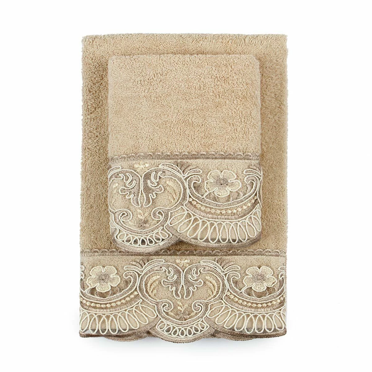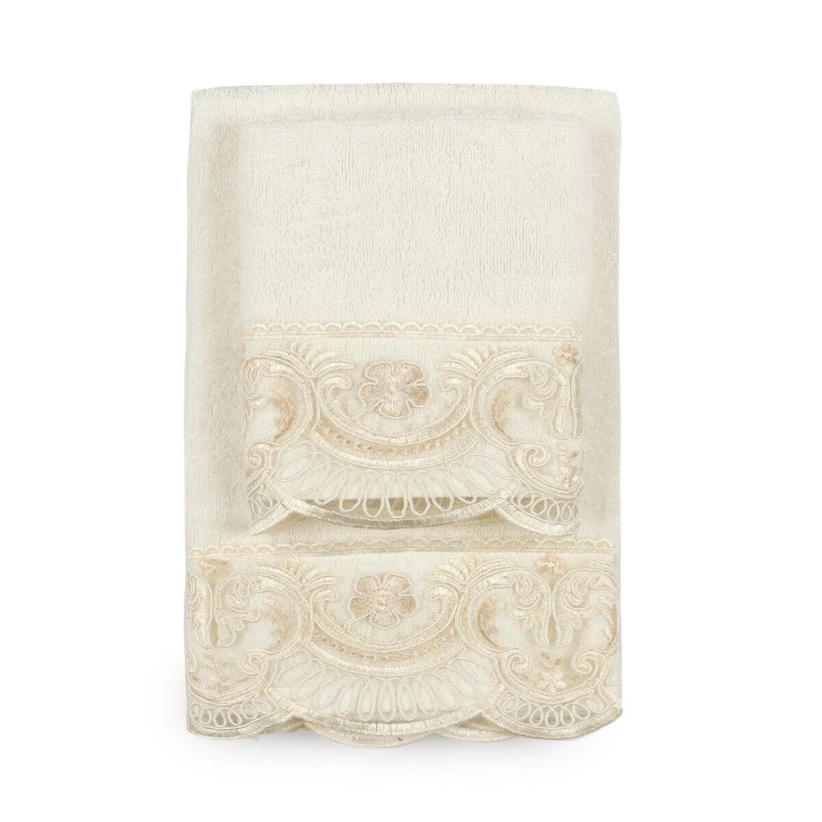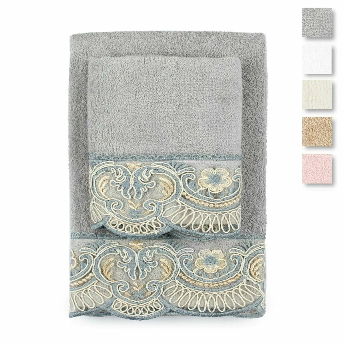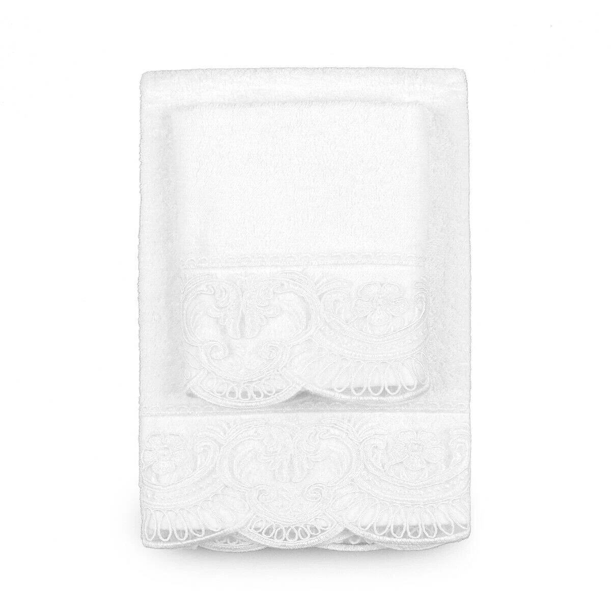| Dettagli | La confezione contiene un set di asciugamani composto da: 1 asciugamano viso 1 asciugamano ospite Morbida spugna a riccio di puro cotone, idrofila ed assorbente Bordo in tessuto con applicazioni in pizzo Made in Italy |