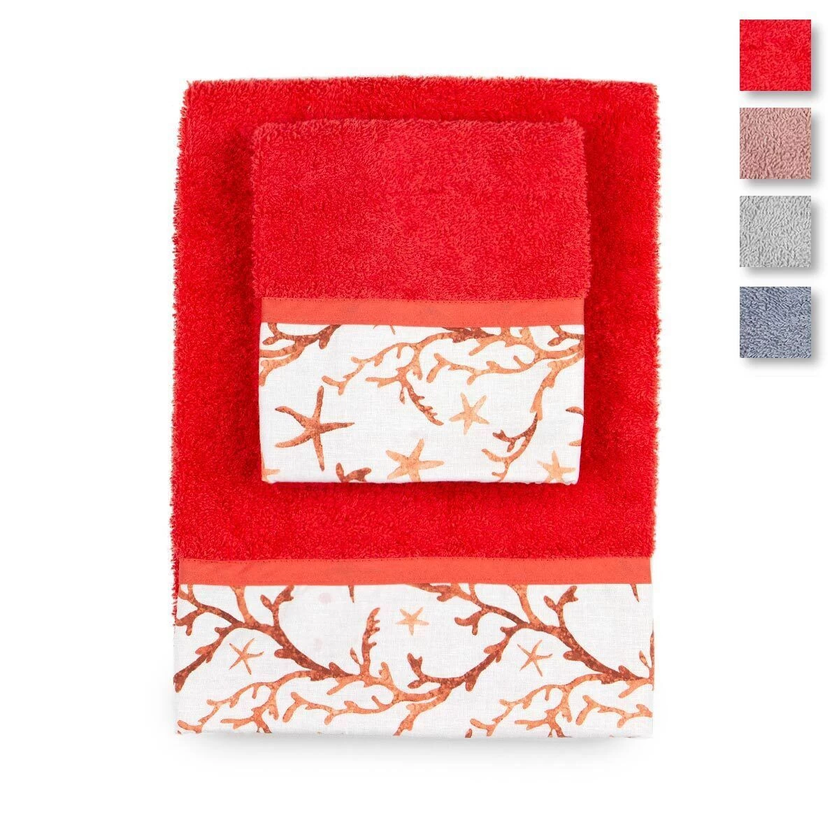 | Dettagli | La confezione contiene un set di asciugamani composto da: 1 asciugamano viso 1 asciugamano ospite Morbida spugna a riccio di puro cotone, idrofila ed assorbente Bordo in cotone, stampa digitale con coralli Made in Italy |