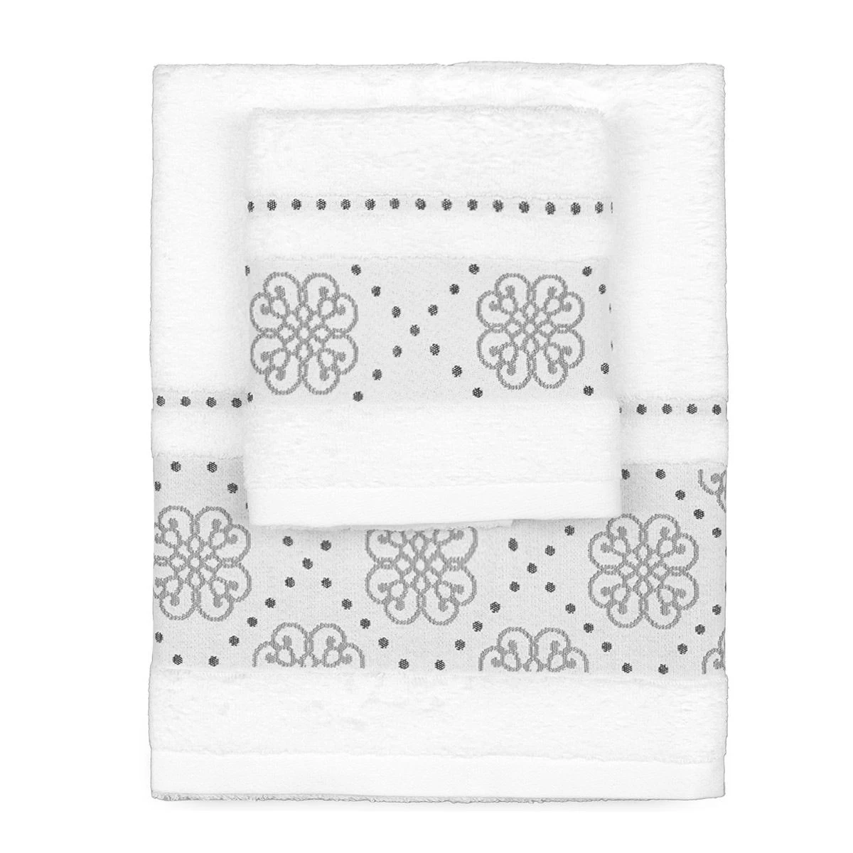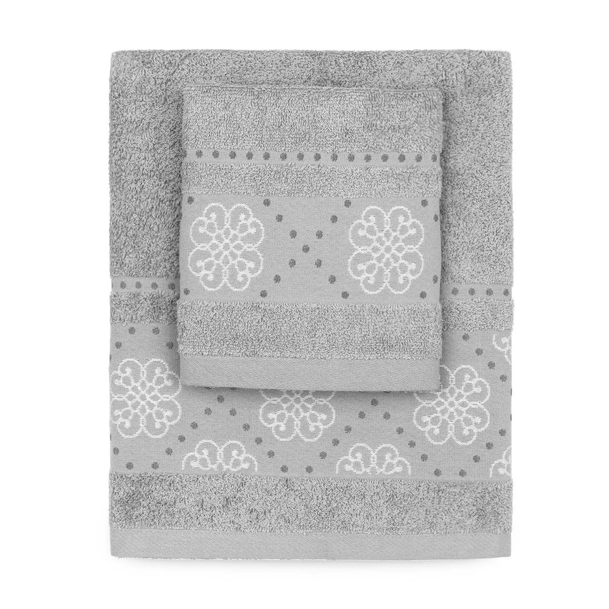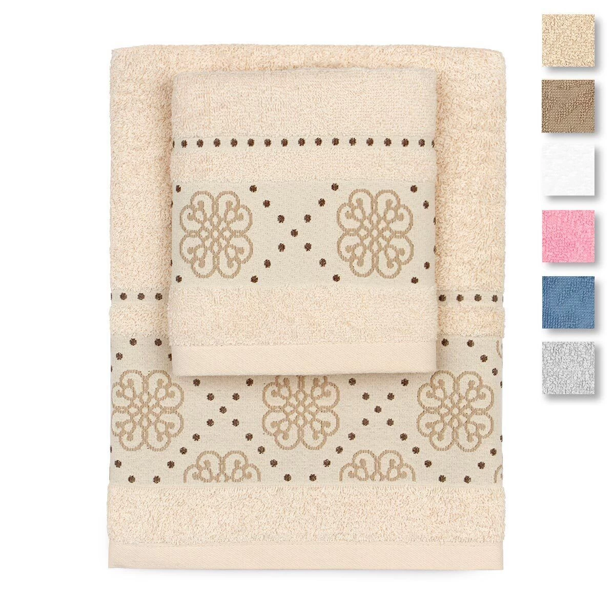 | Dettagli | La confezione contiene un set di asciugamani composto da: 1 asciugamano viso 1 asciugamano ospite Bordo in cotone con piccoli fiori e pois ricamati Morbida spugna di cotone con lavorazione jacquard Certificato OEKO-TEX che attesta l’assenza di sostanze nocive per l’uomo e l’ambiente |