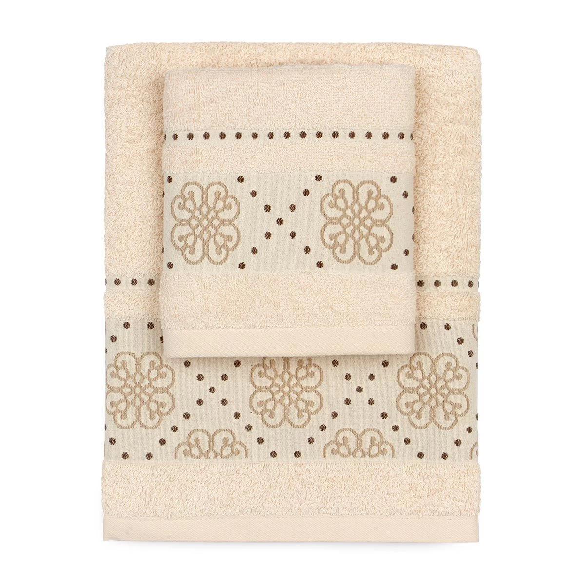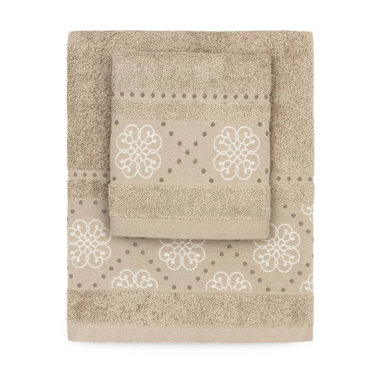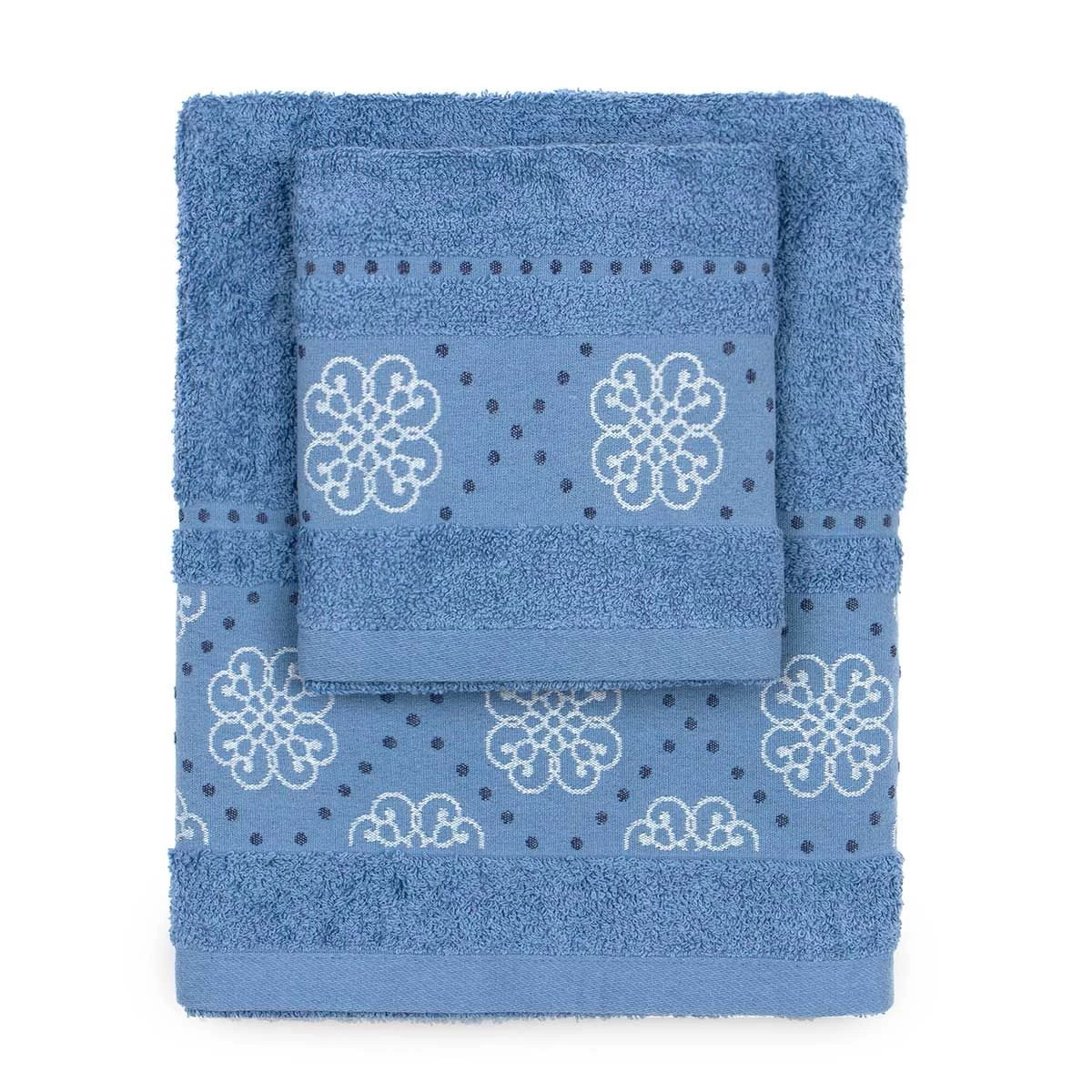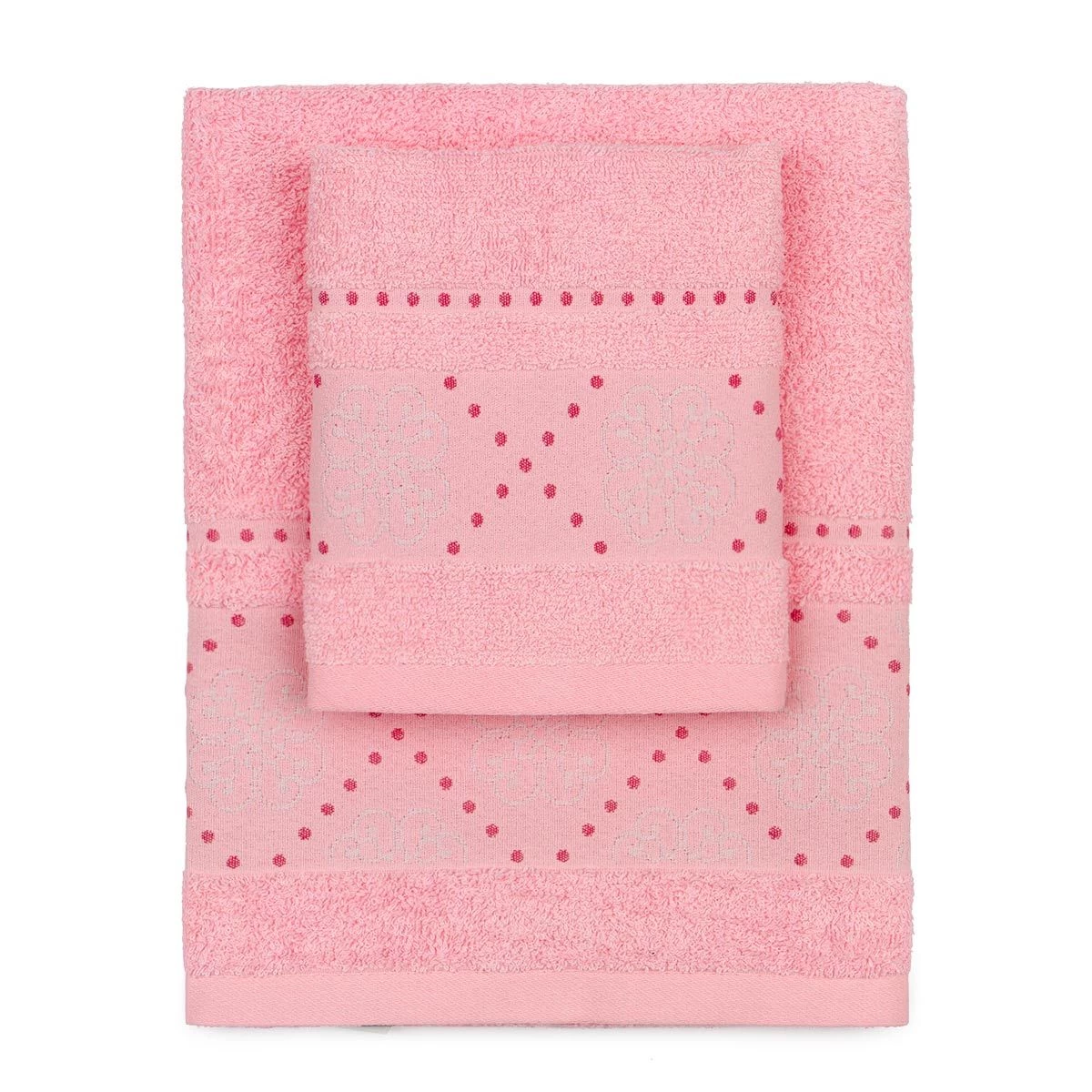 | Dettagli | La confezione contiene un set di asciugamani composto da: 1 asciugamano viso 1 asciugamano ospite Bordo in cotone con piccoli fiori e pois ricamati Morbida spugna di cotone con lavorazione jacquard Certificato OEKO-TEX che attesta l’assenza di sostanze nocive per l’uomo e l’ambiente |