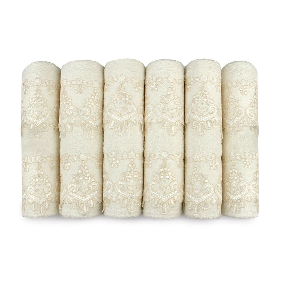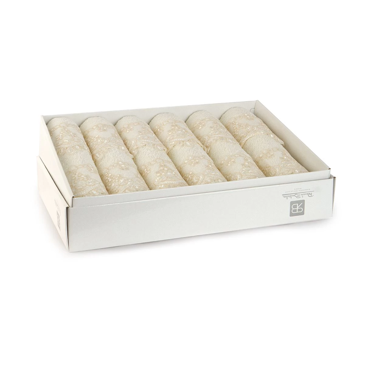 | Dettagli | La confezione contiene un set di asciugamani da 12 pezzi composto da: 6 asciugamani viso e 6 asciugamani ospite Spugna idrofila di puro cotone Applicazioni con pizzo rebrodè Tessuto di prima qualità Confezionamento artigianale Gli asciugamani sono custoditi all’interno di una scatola in cartone rigido Certificato interno di garanzia e qualità Ottima anche come idea regalo |