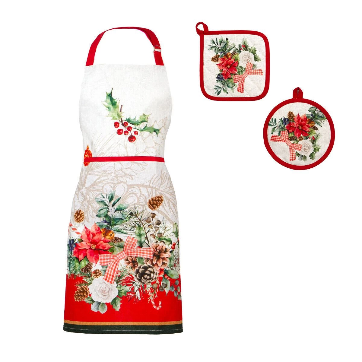 | Dettagli | La confezione comprende un set da cucina composto da: 1 presina rotonda 1 resina quadrata 1 grembiule Guanto e presina dotati di appendino Grembiule con ampia tasca anteriore e laccetti Motivo natalizio Stampa digitale ad alta definizione Puro cotone, resistente ai numerosi lavaggi Adatto come decorazione di Natale Disegnato e progettato in Italia |